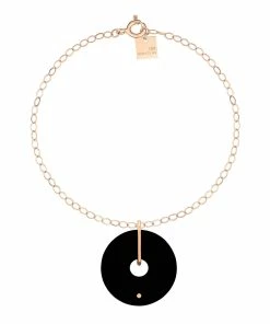 Bracelet chaîne en or rose, avec pendentif disque en pierre d’onyx noire. Fermoir classique à ressort.