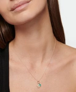 Collier chaîne fine en or rose orné de deux charms iconiques de la maison Ginette NY associé à un disque de turquoise. Fermoir classique à ressort.