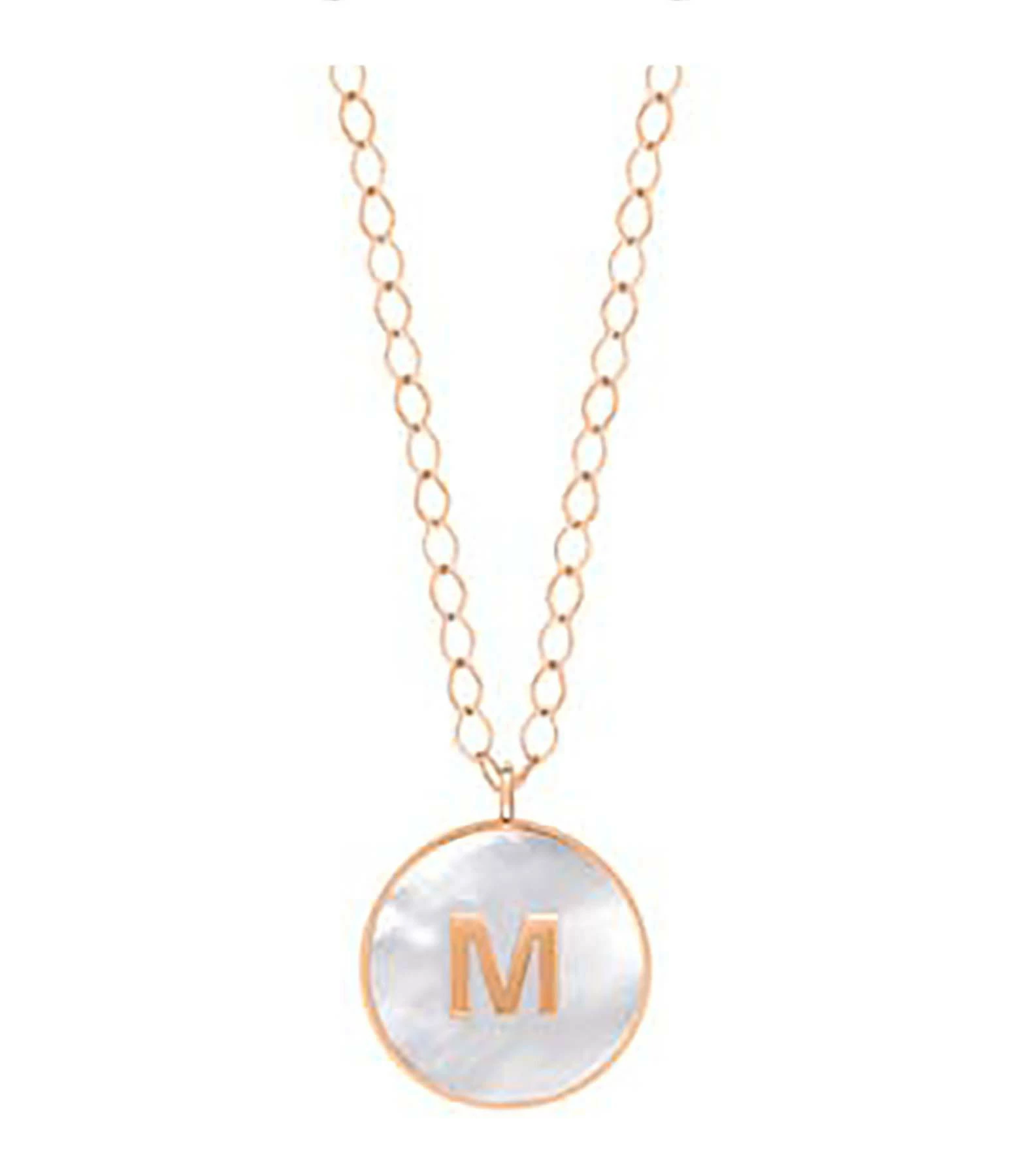 Collier sur chaîne en or rose avec pendentif en nacre blanche et lettre au choix en or rose. Fermoir anneau ressort.