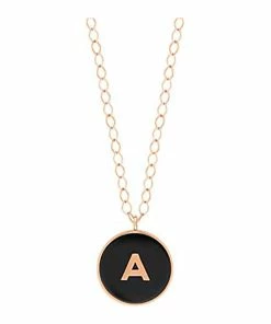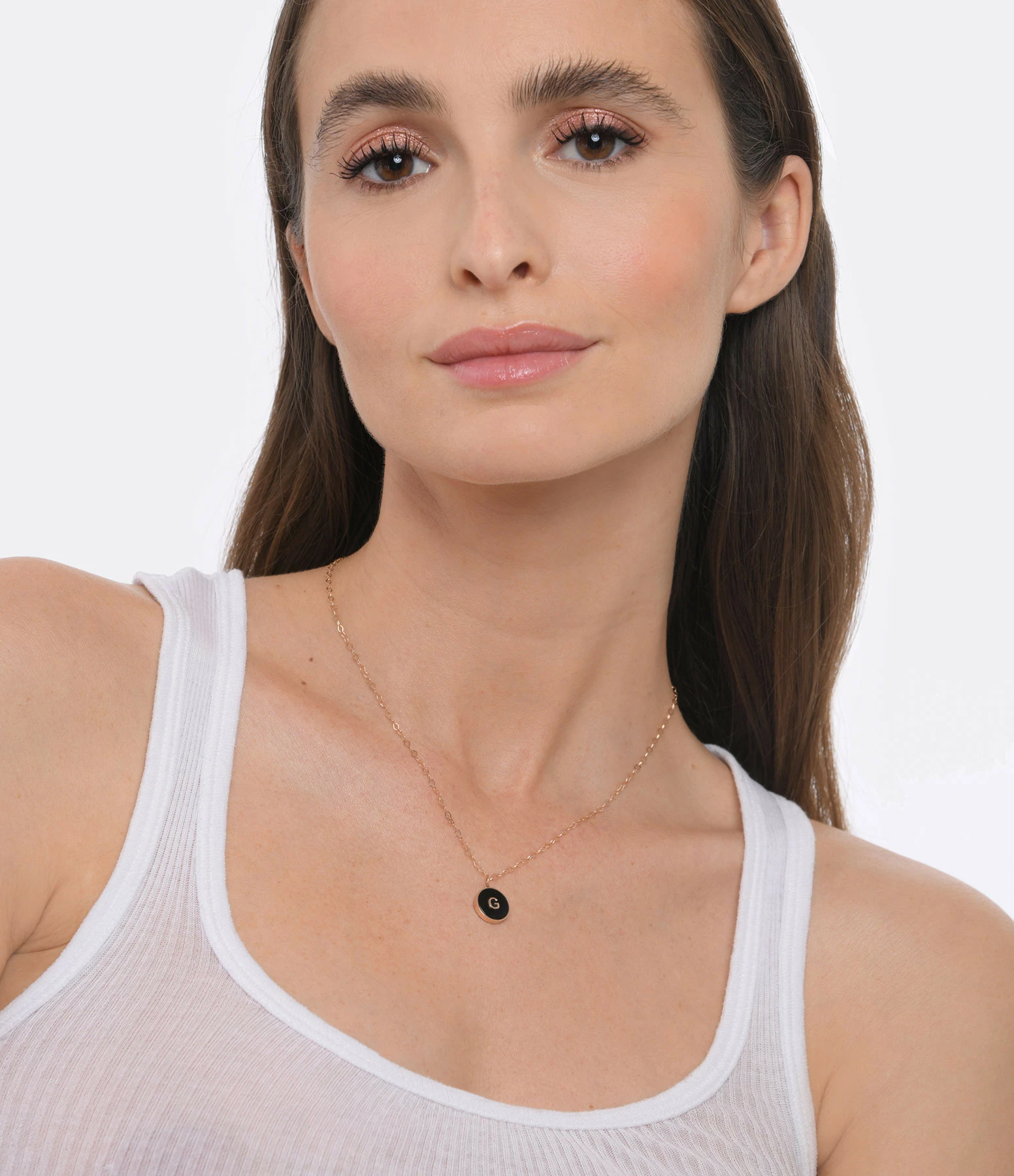Collier sur chaîne en or rose avec pendentif en onyx et lettre au choix en or rose. Fermoir anneau ressort.