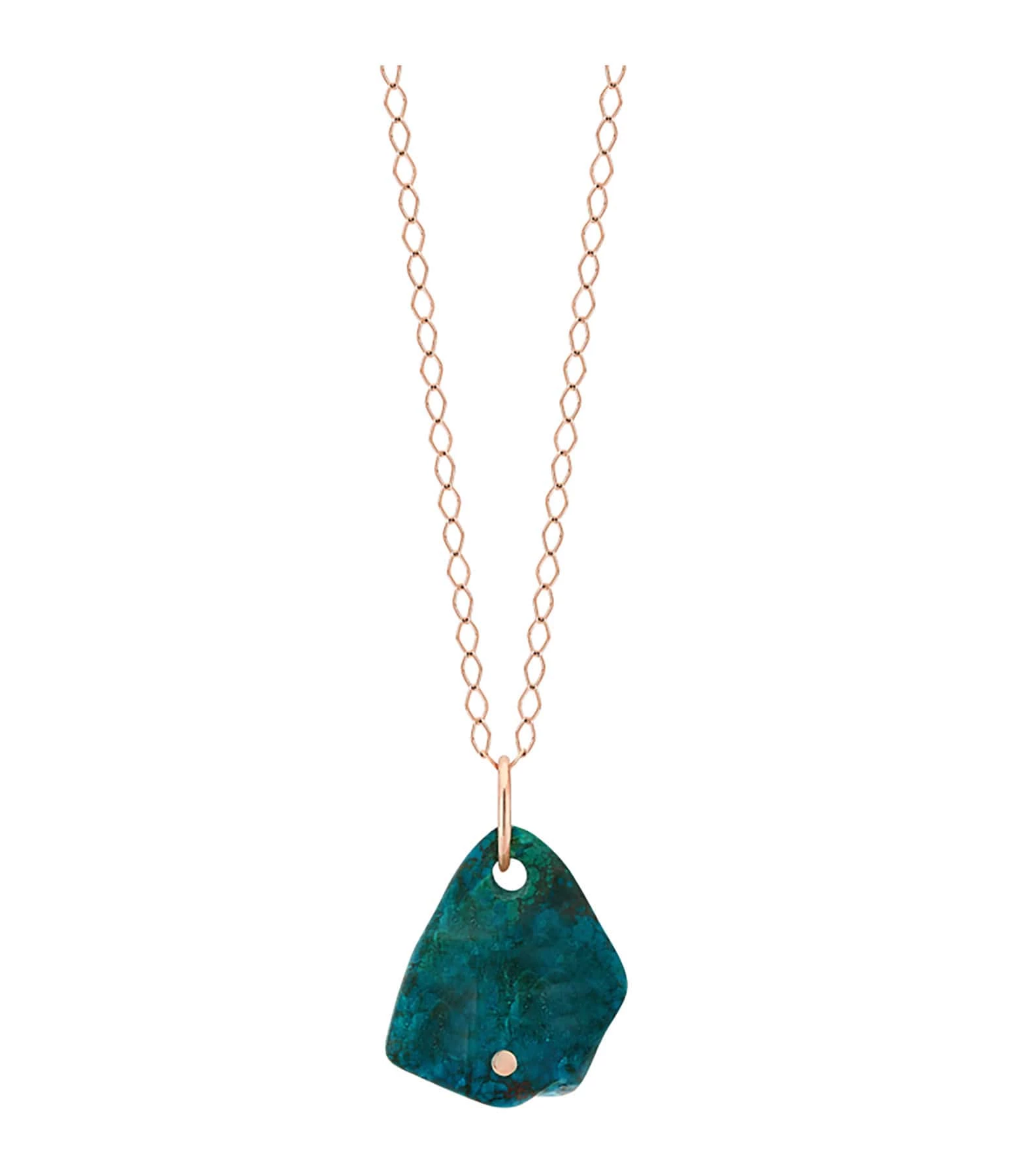 Collier sur chaîne en or rose avec pendentif en chrysocolle. Fermoir classique à ressort.