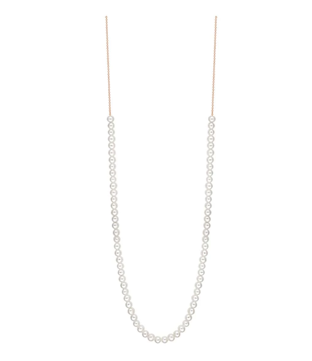 Collier sur chaîne en or rose agrémenté de perles blanches. Fermoir classique à ressort avec un contre-anneau.