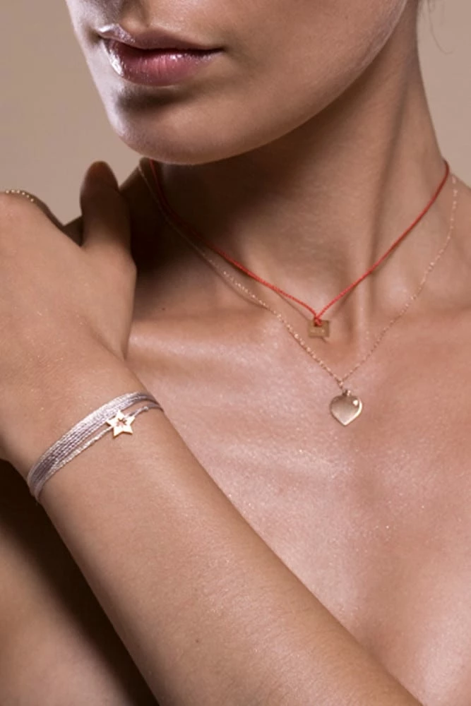 Collier sur lien en soie avec mini pendentif en or rose. Coloris du lien aléatoire.