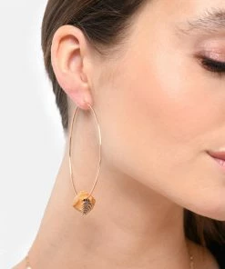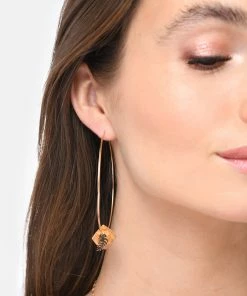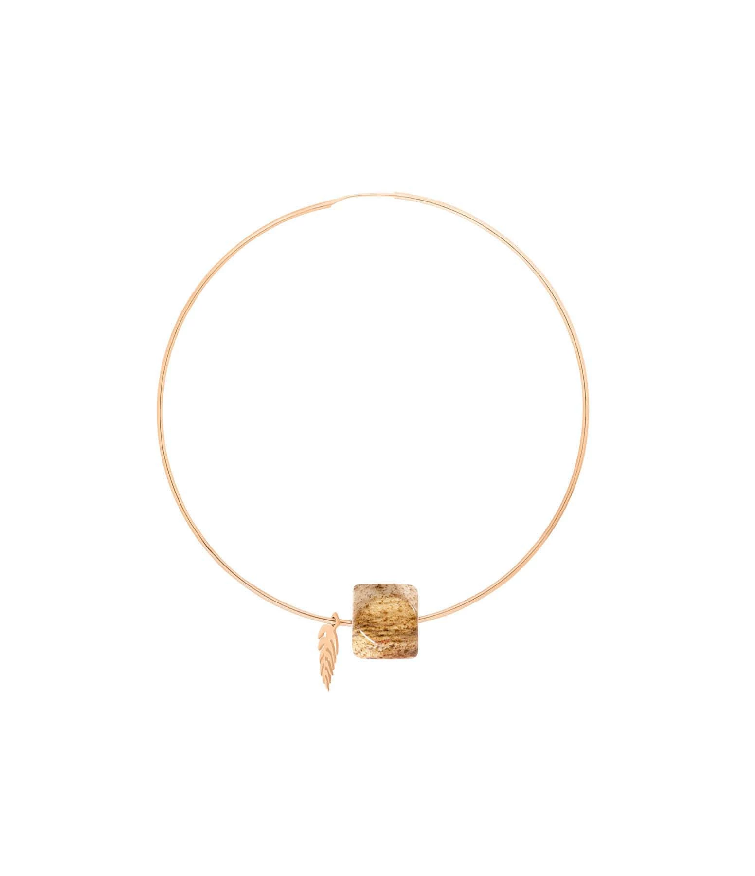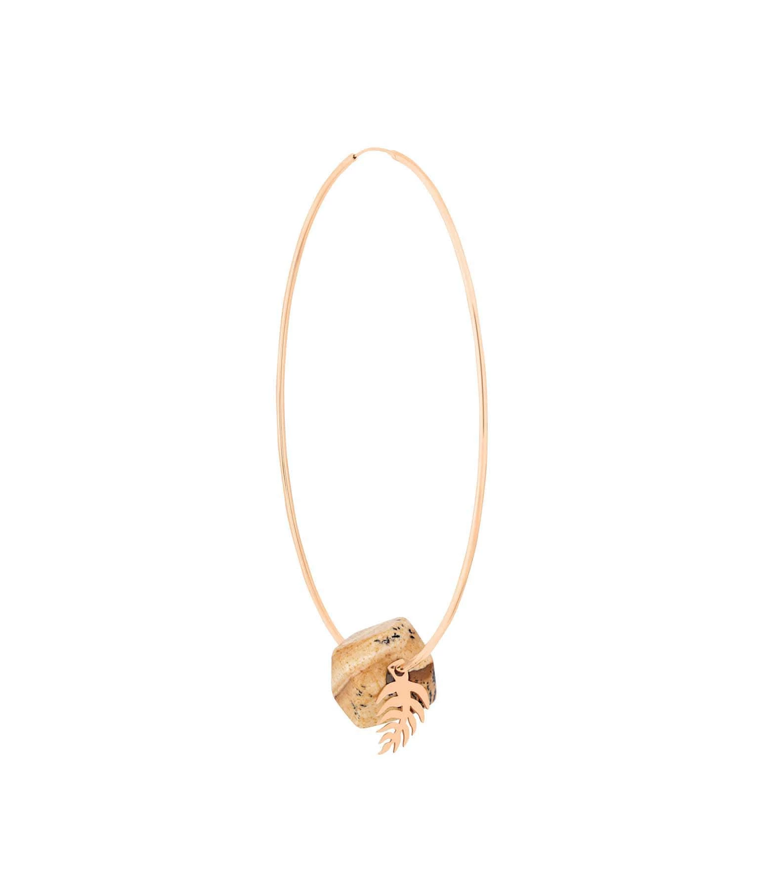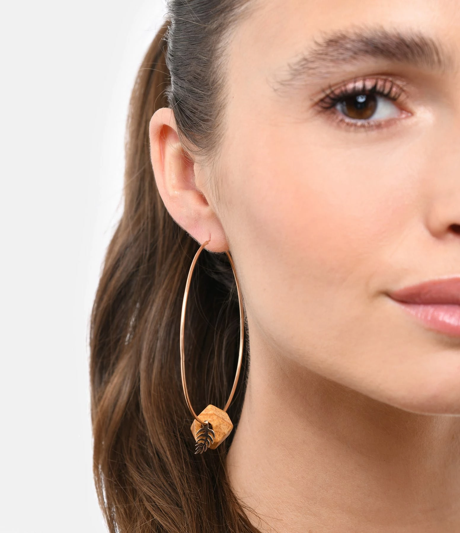 Boucle d’oreille créole en or rose, agrémentée d’une pampille carrée en japse et feuille de palmier en or rose. Fermoir créole. Vendue à l’unité.