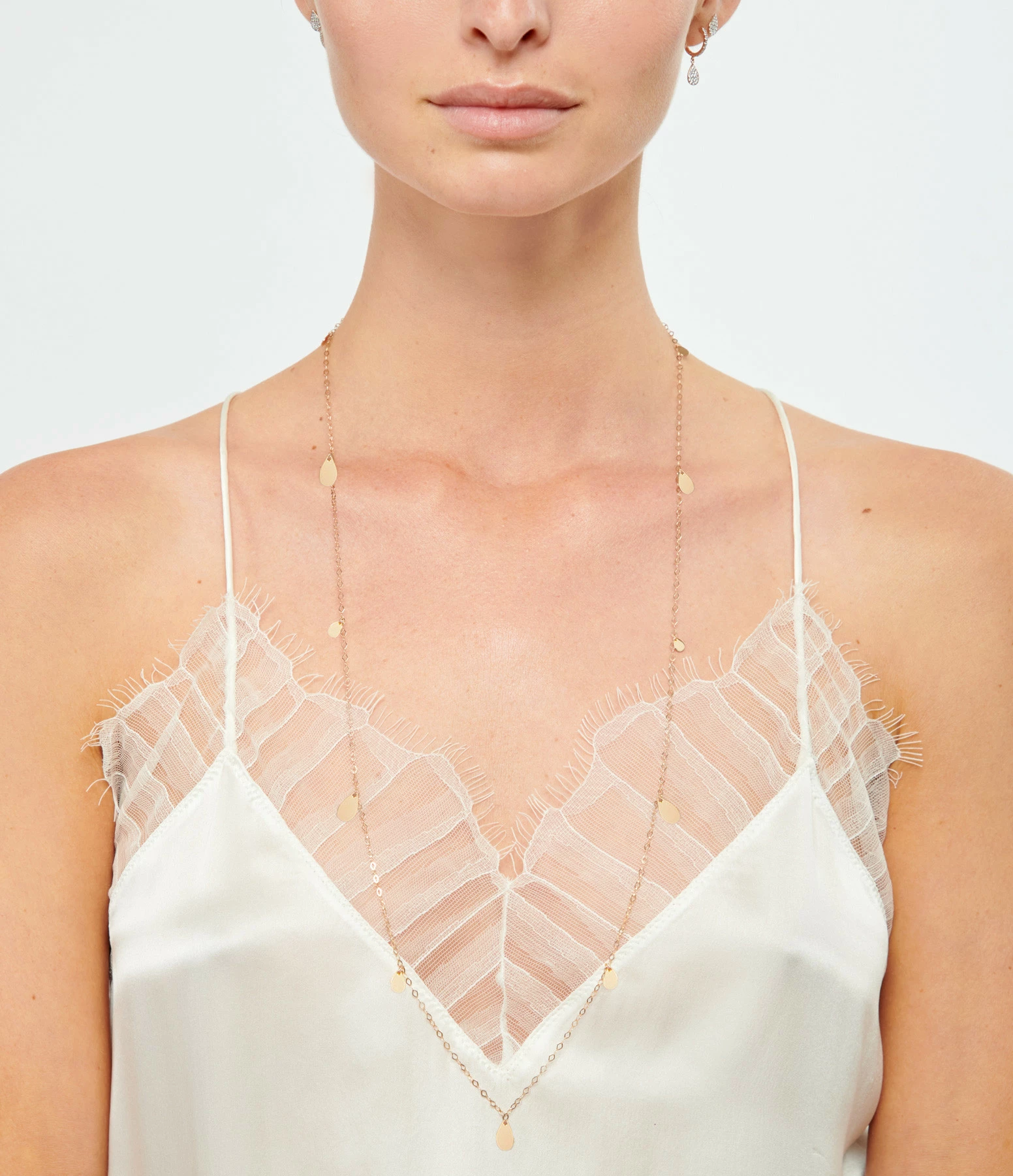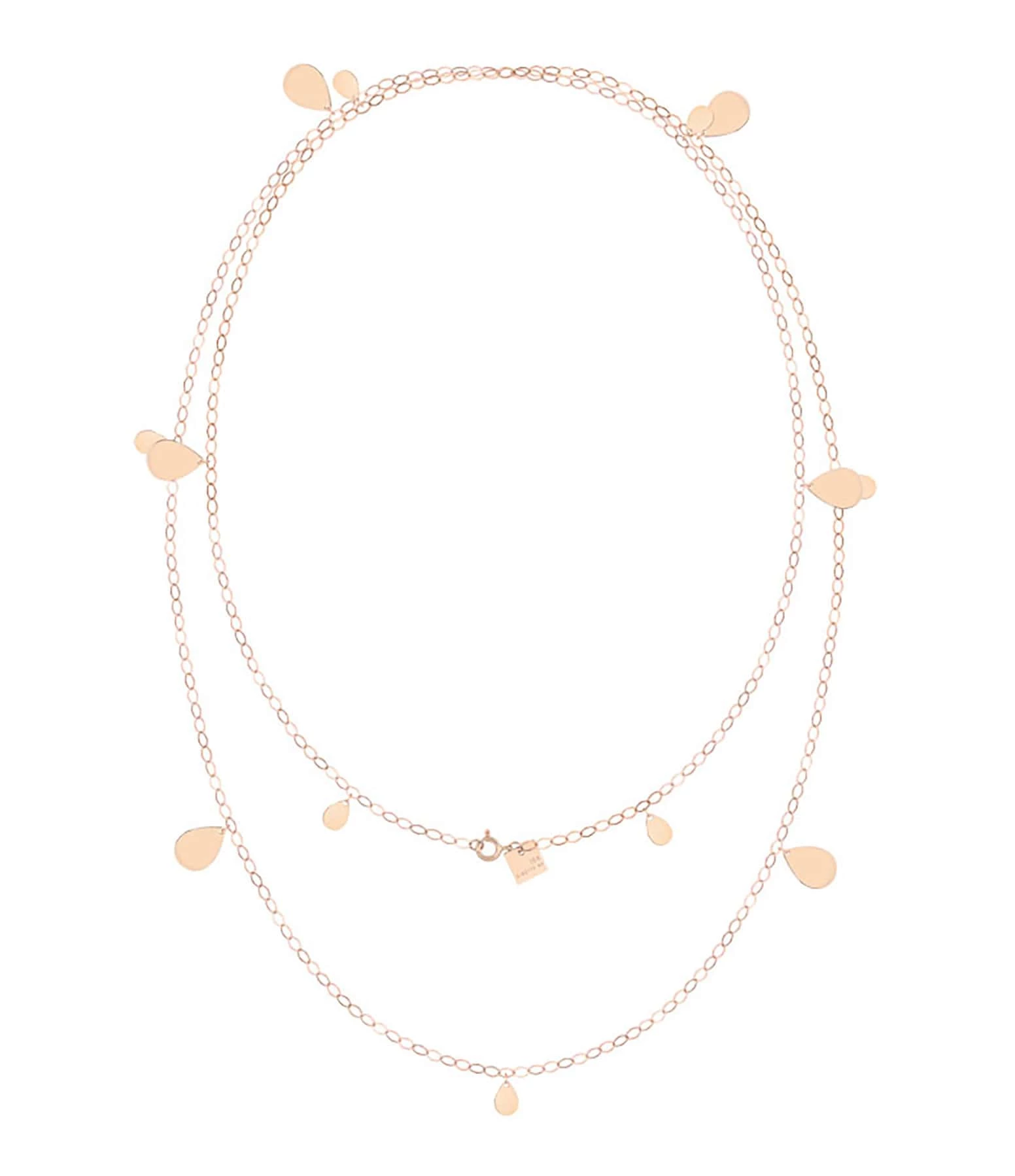 Collier long sur chaîne en or rose orné de 13 pendentifs en forme de gouttes. Fermoir classique à ressort.
