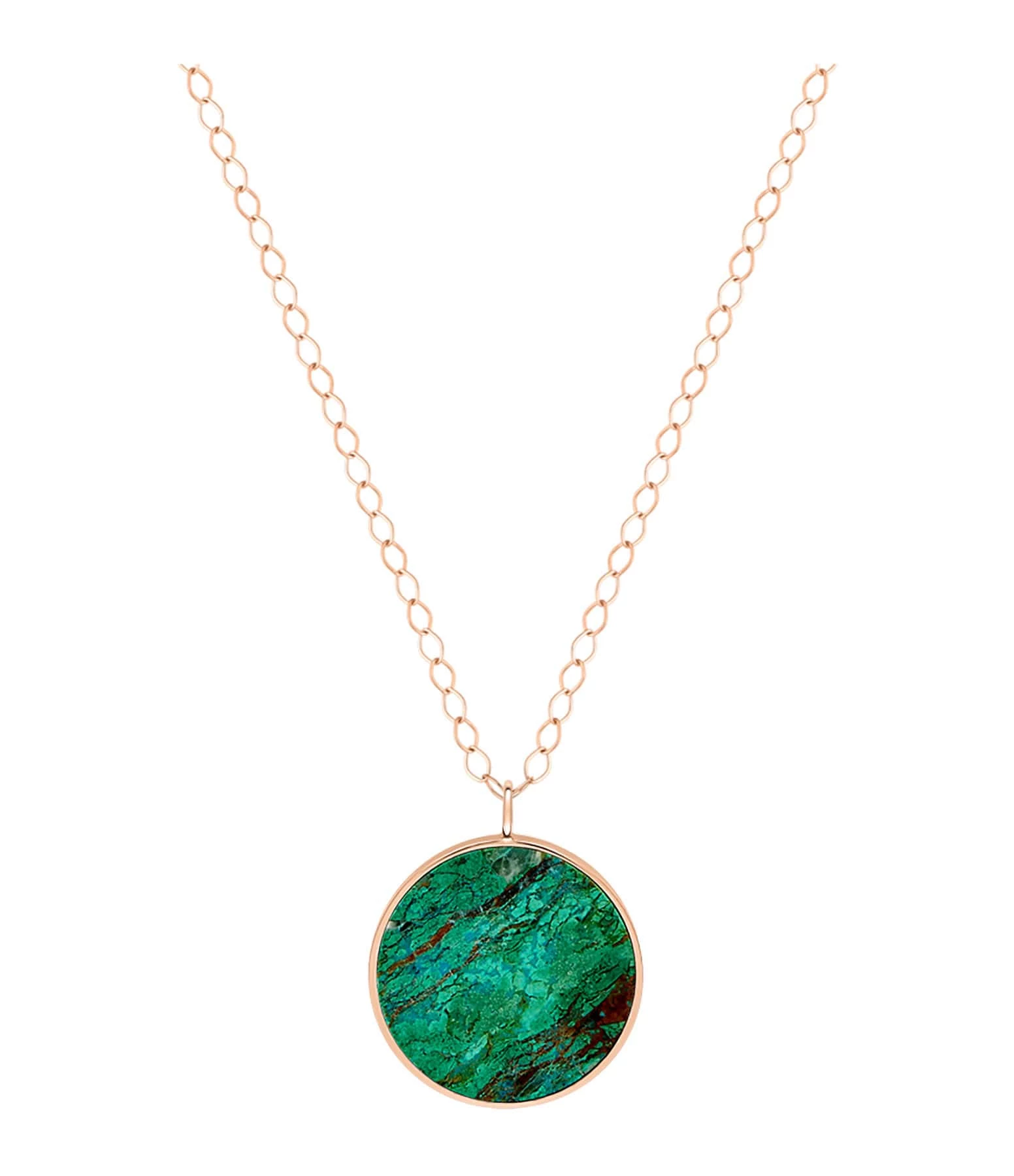 Collier sur chaîne en or rose avec pendentif en pierre de chrysocolle verte. Fermoir classique ressort.