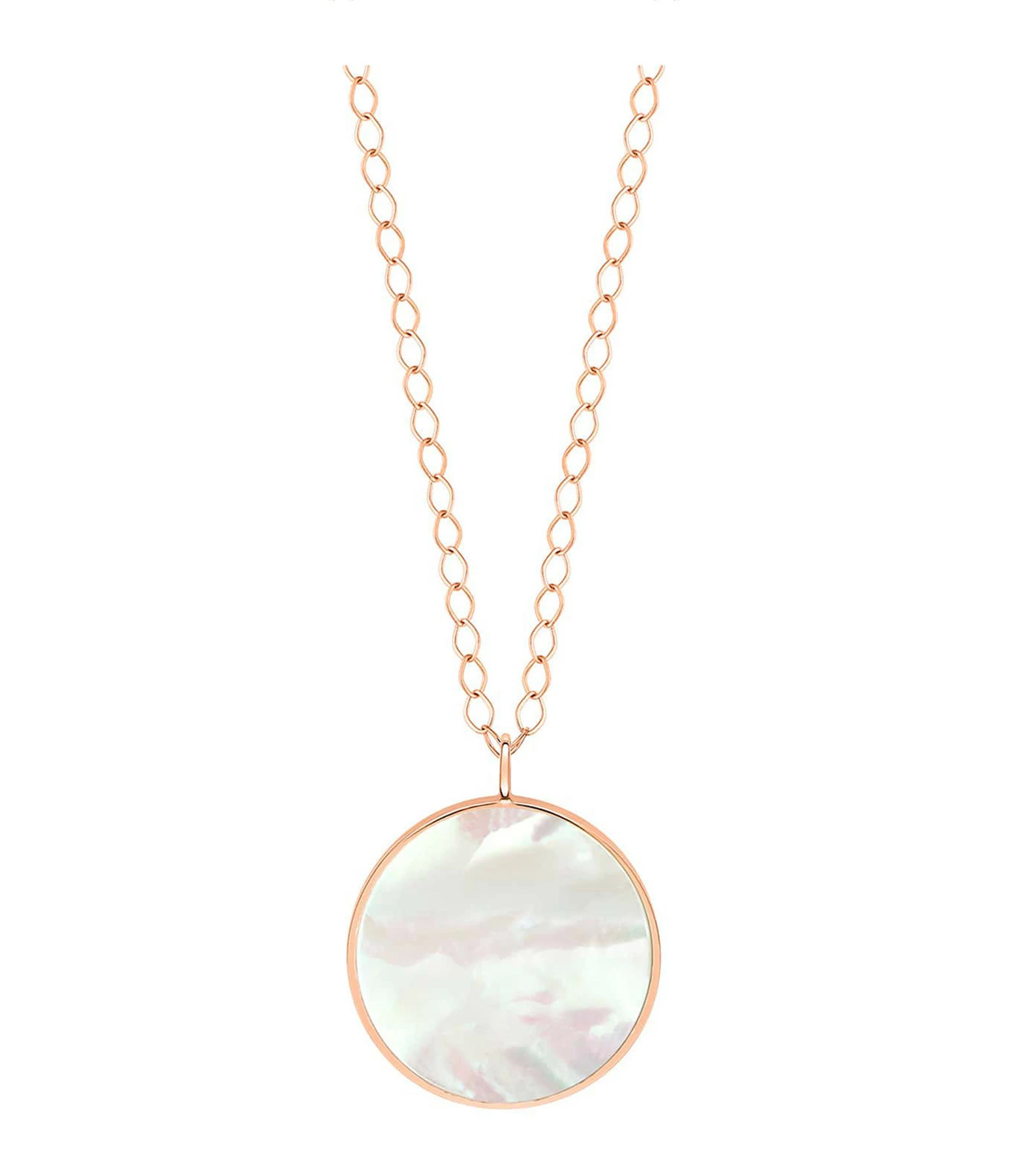 Collier sur chaîne en or rose avec pendentif en nacre blanche. Fermoir anneau ressort.