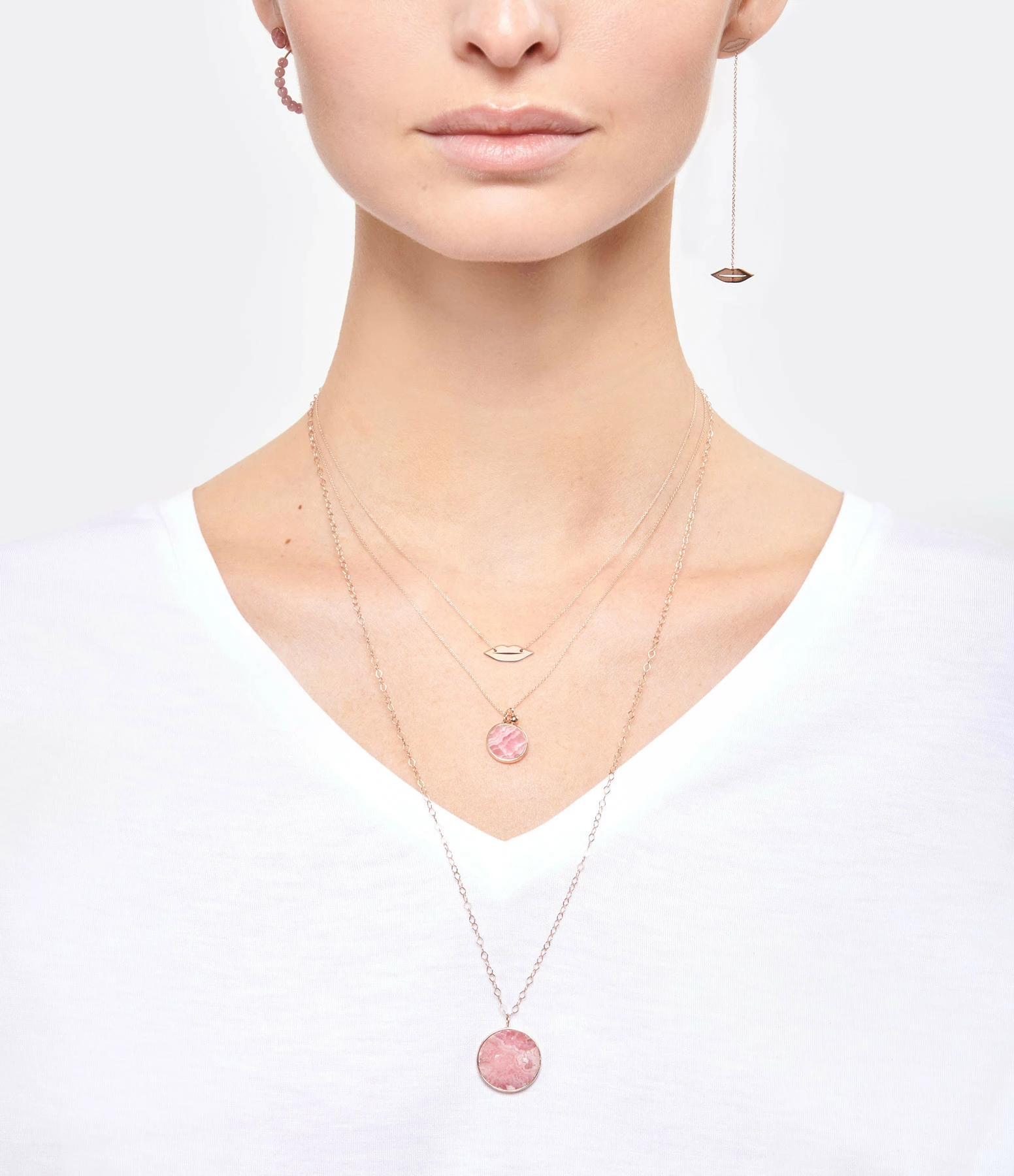 Collier sur chaîne en or rose avec pendentif en pierre de rhodochrosite rose . Fermoir classique avec contre-anneau et ressort.