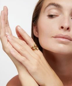 Bague en laiton trempé dans un bain d’or jaune 24 carats orné de cabochons en cristal de roche naturel. Logo gavé à l’intérieur de l’anneau.
