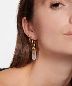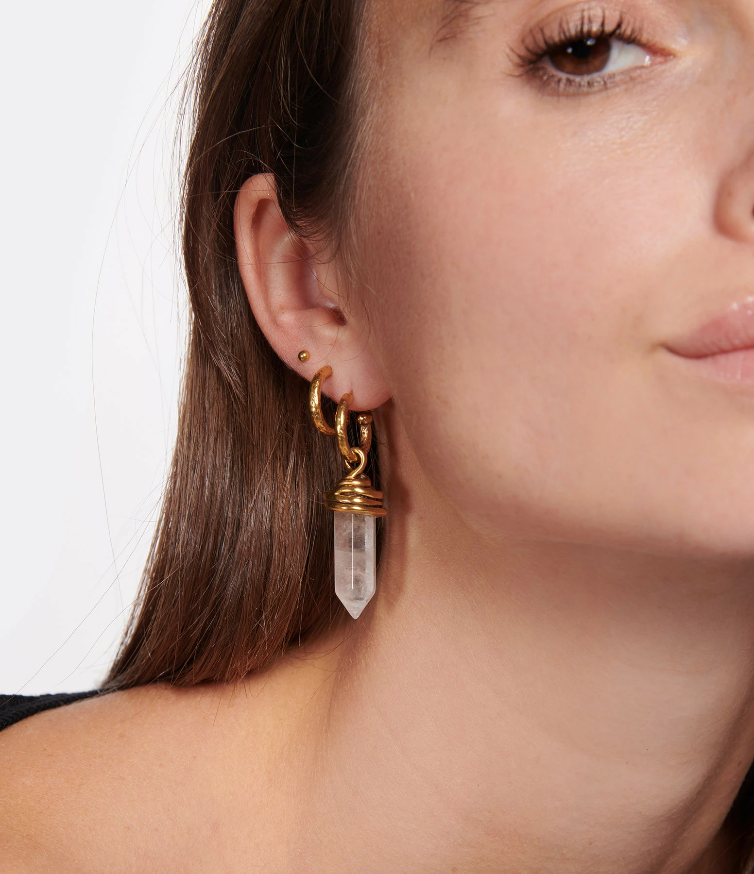 Boucle d’oreille en laiton trempé dans un bain d’or 24 carats, couleur or jaune, ornée d’un cabochon en cristal de roche. Fermoir poussette.