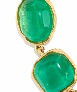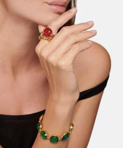 Bracelet en plaqué or, orné de sept pierres de cristal de roche teintées à la main en vert émeraude. Fermoir en S avec contre-anneau.