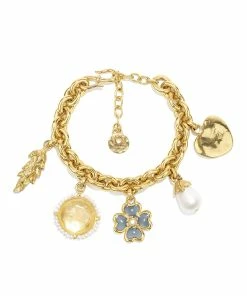 Bracelet doré en maillons entrecroisés, ornés de différents pendentifs emblématiques de la Maison Goossens ; trèfle, blé, médaille, perle et cœur. Fermoir en S avec contre-anneau.