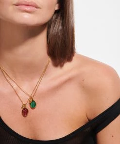 Pendentif en laiton trempé dans un bain d’or jaune 24 carats orné d’un cristal de roche teinté rose indien et d’une pampille Goosens. Chaîne forçat ajustable en trois longueurs avec fermoir mousqueton.