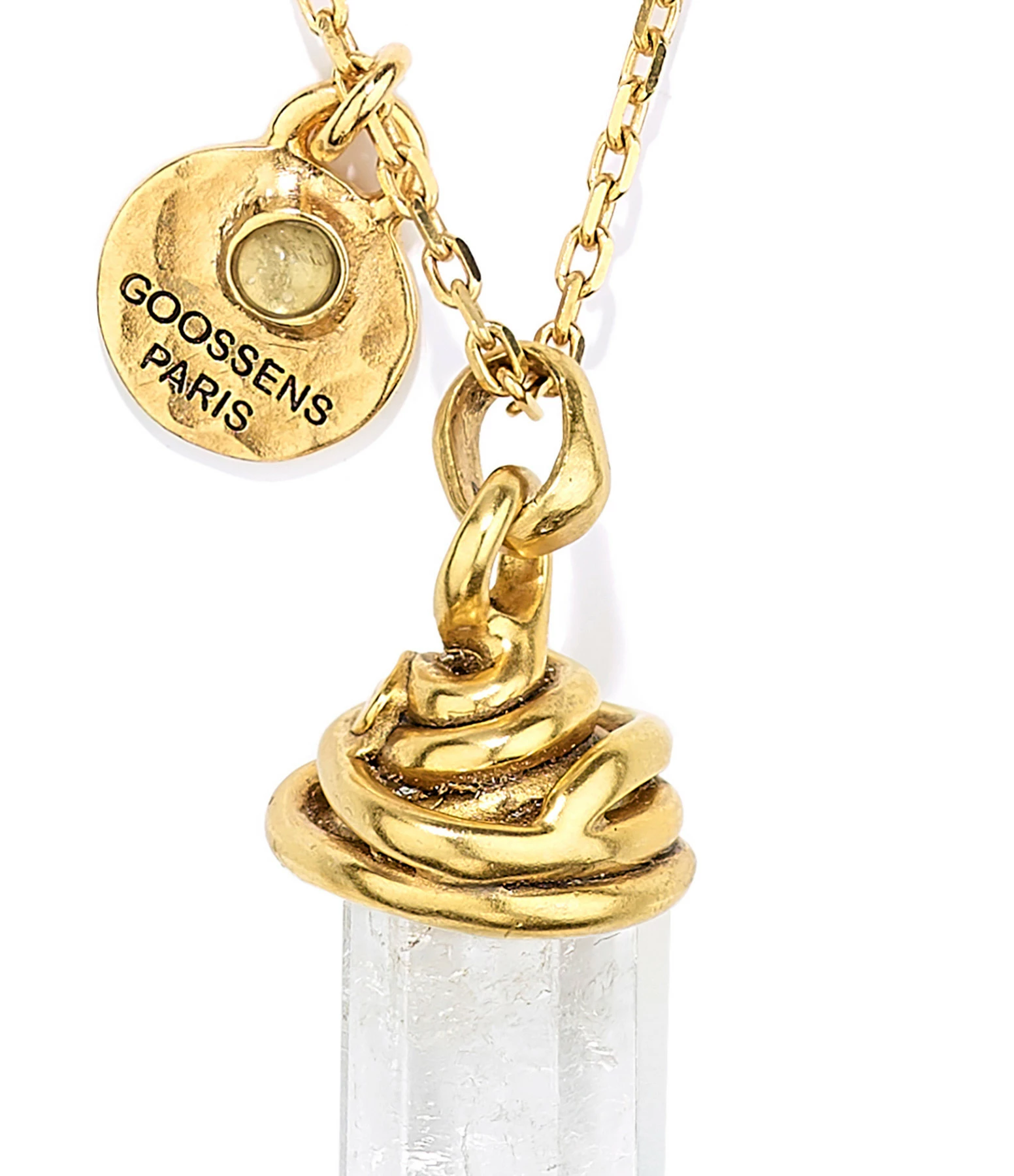 Collier en laiton trempé dans un bain d’or 24 carats, couleur or jaune, orné d’un pendentif en cristal de roche.