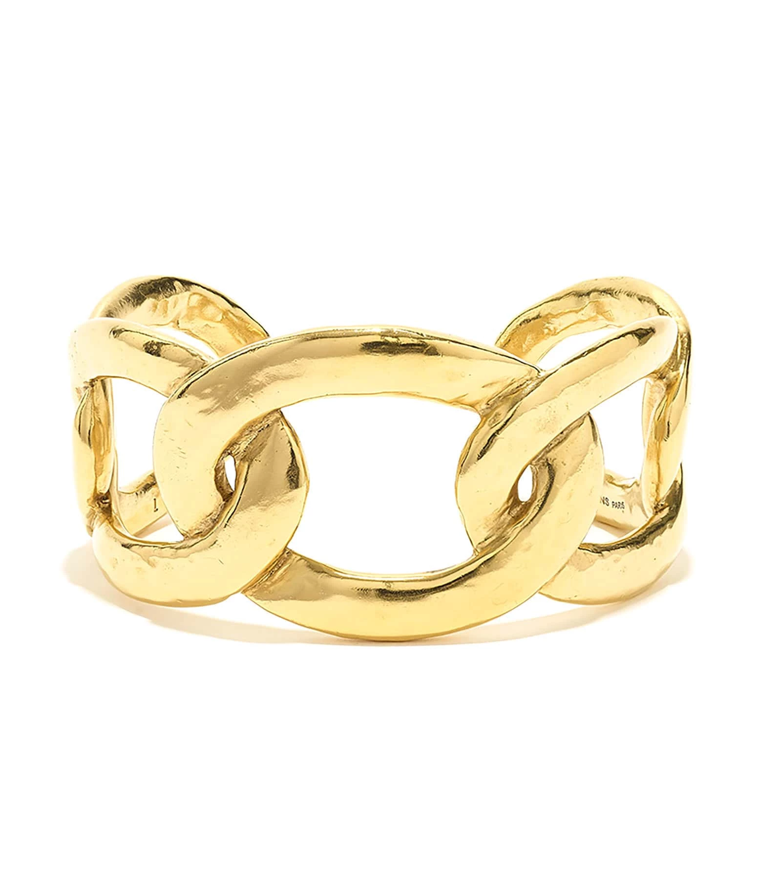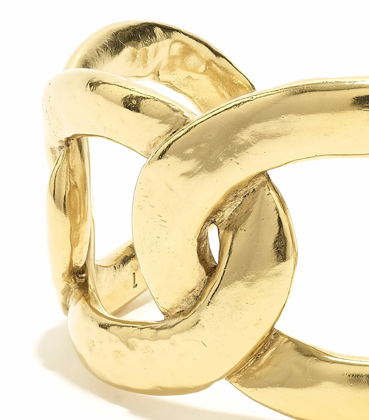 Bracelet en métal trempé dans un bain d’or 24 carats, coloris or jaune. Gros maillons martelés à la main.