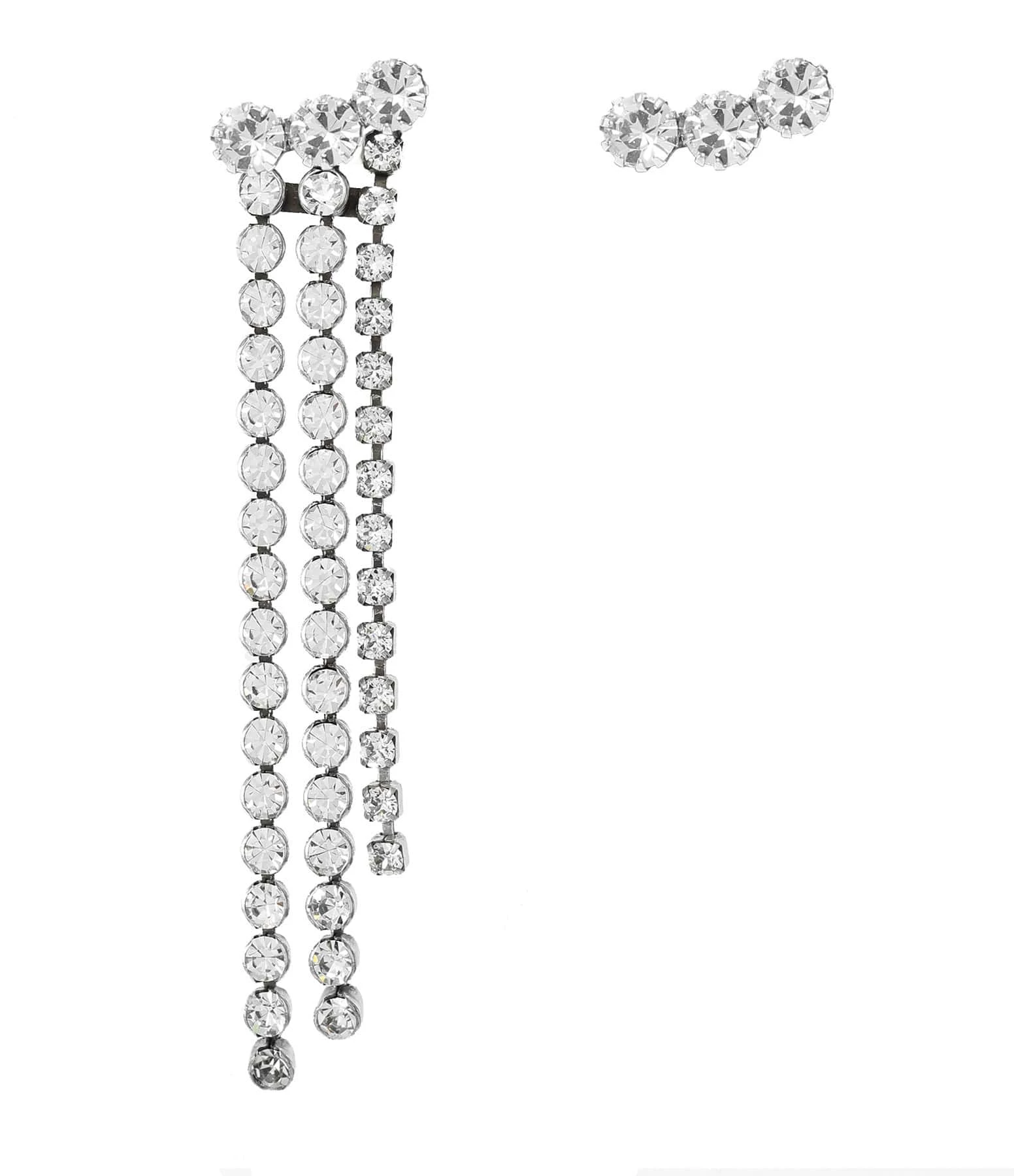 Boucles d’oreilles asymétriques argentées en laiton. Une puce avec trois pierres en verres et une pendante. Fermoir poussette.
