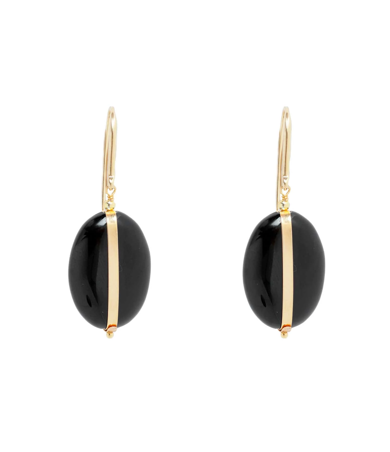 Boucles d’oreilles ovales en laiton doré et pierre noire. Attache crochet.