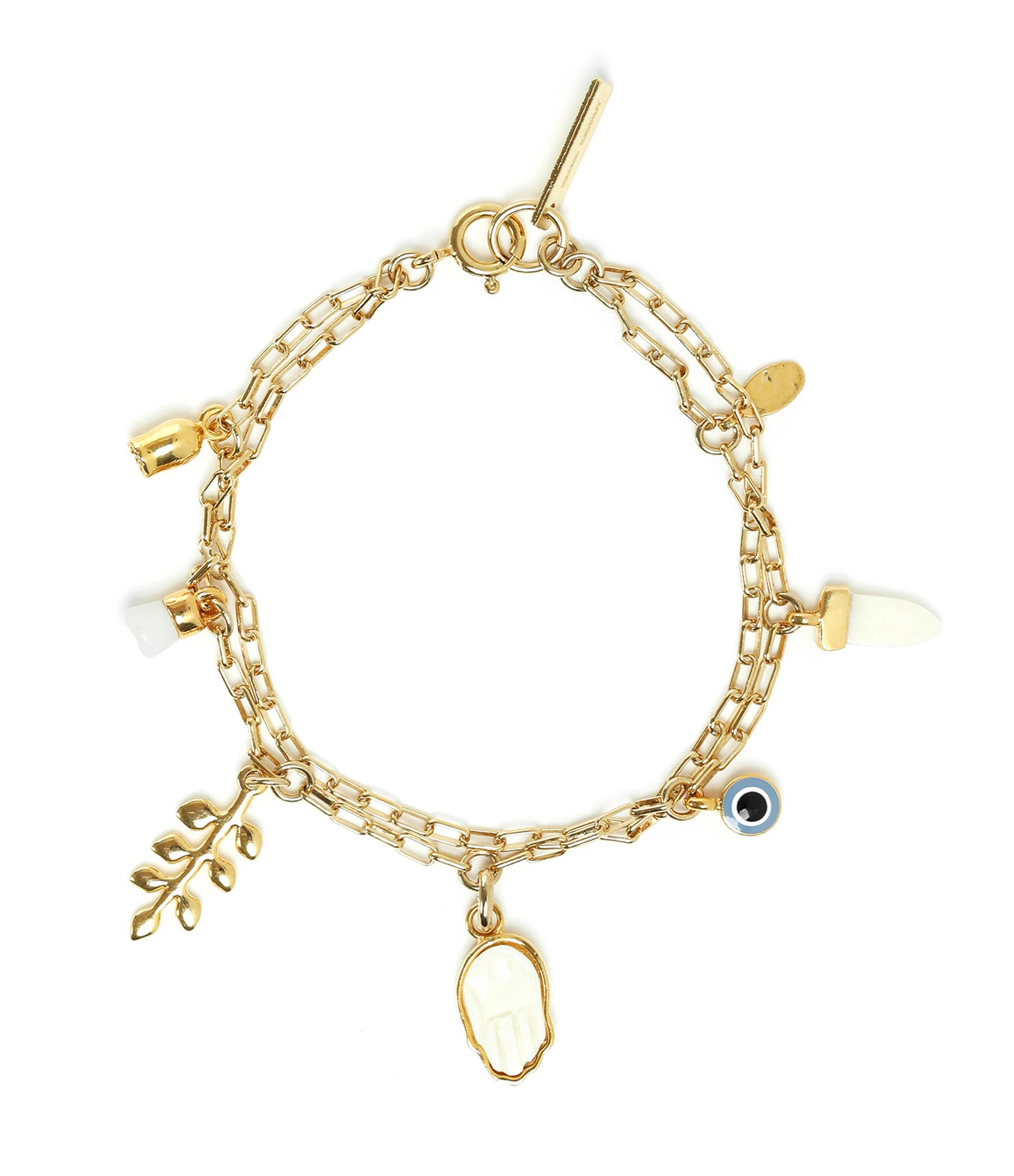 Bracelet deux rangs en laiton doré. Maillons de la chaîne de forme rectangulaires. Sept pampilles différentes. Fermoir classique à ressort.