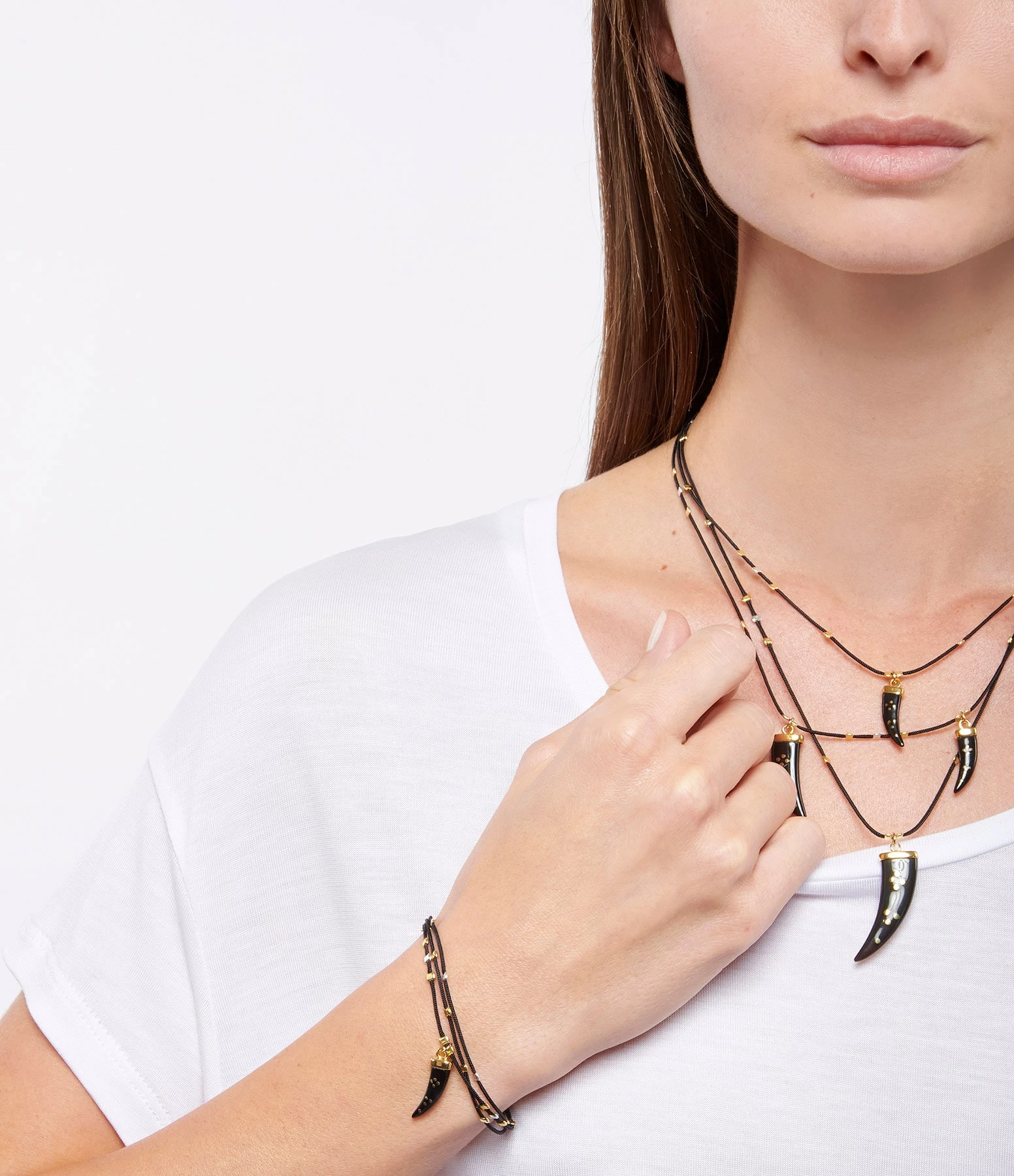 Bracelet trois rangs avec corne de buffle noire et dorée sur cordon noir. Fermoir classique à ressort.