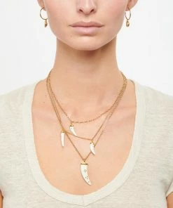 Collier trois chaînes doré en laiton. Maillons de la chaîne de différentes formes. Cornes de buffle écru sur chaque rang. Fermoir classique à ressort.