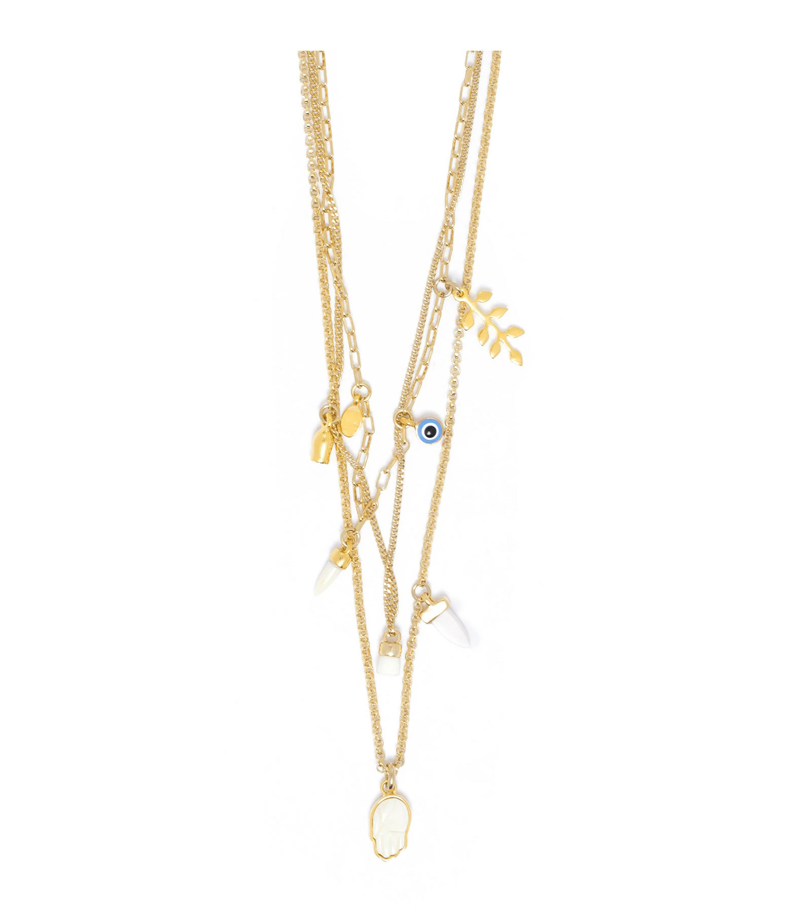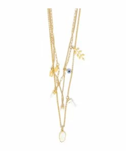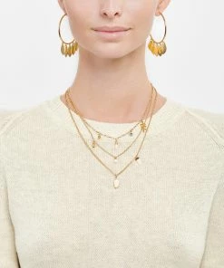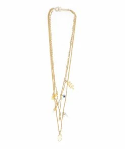 Collier trois rangs en laiton doré. Maillons de la chaîne de différentes formes. Pampilles sur chaque rang. Fermoir classique à ressort.