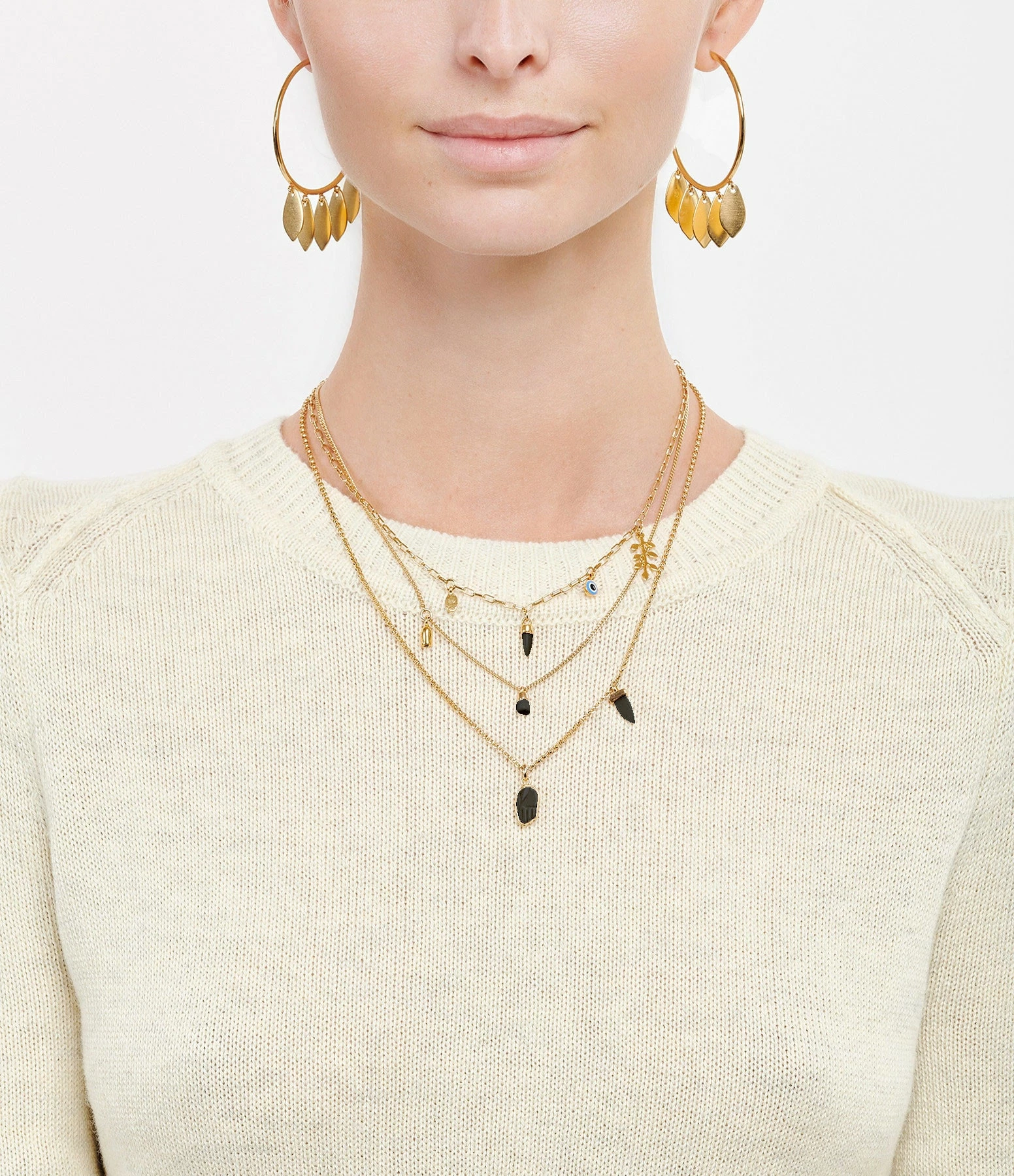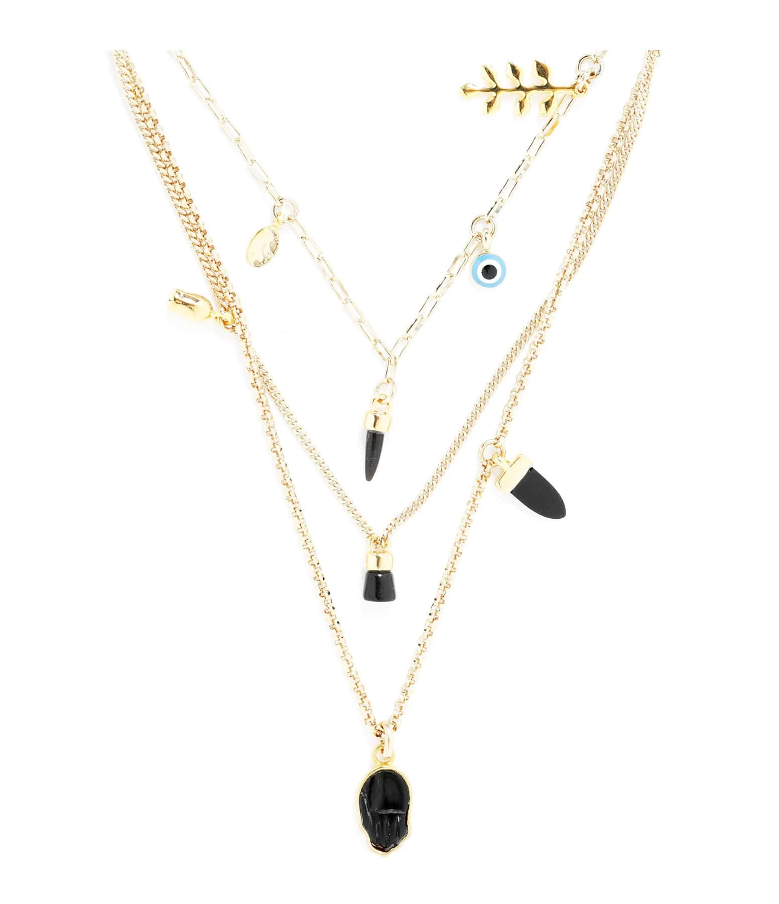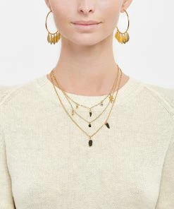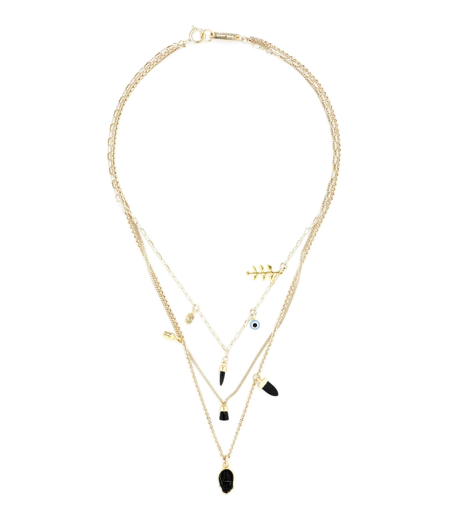Collier trois rangs en laiton doré. Maillons de la chaîne de différentes formes. Pampilles sur chaque rang. Fermoir classique à ressort.
