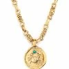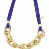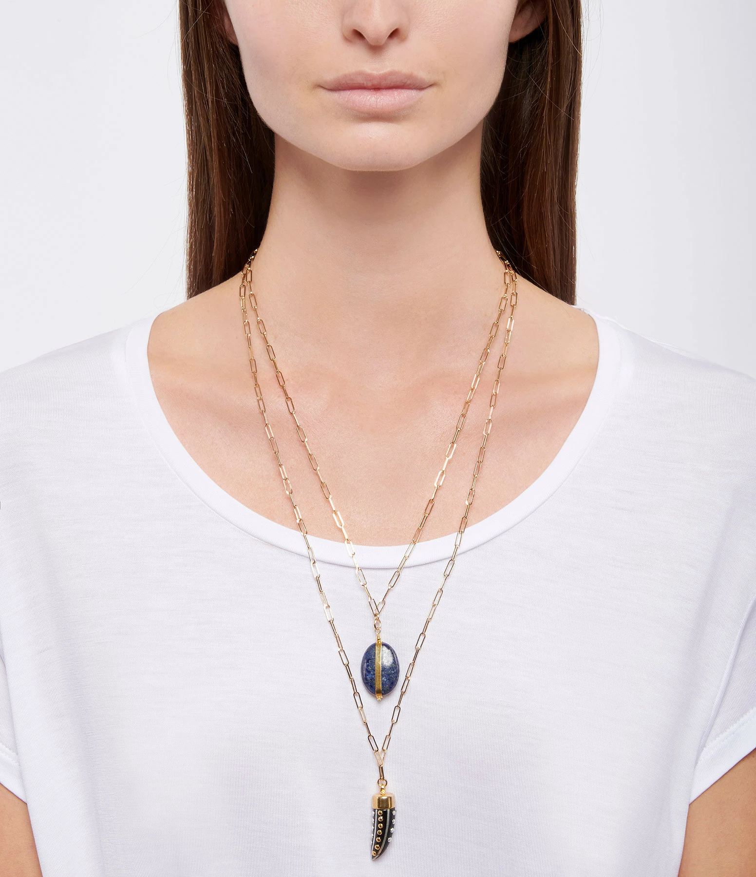 Collier sur chaîne dorée. Pendentif ovale en laiton doré et pierre bleue. Fermoir classique à ressort.