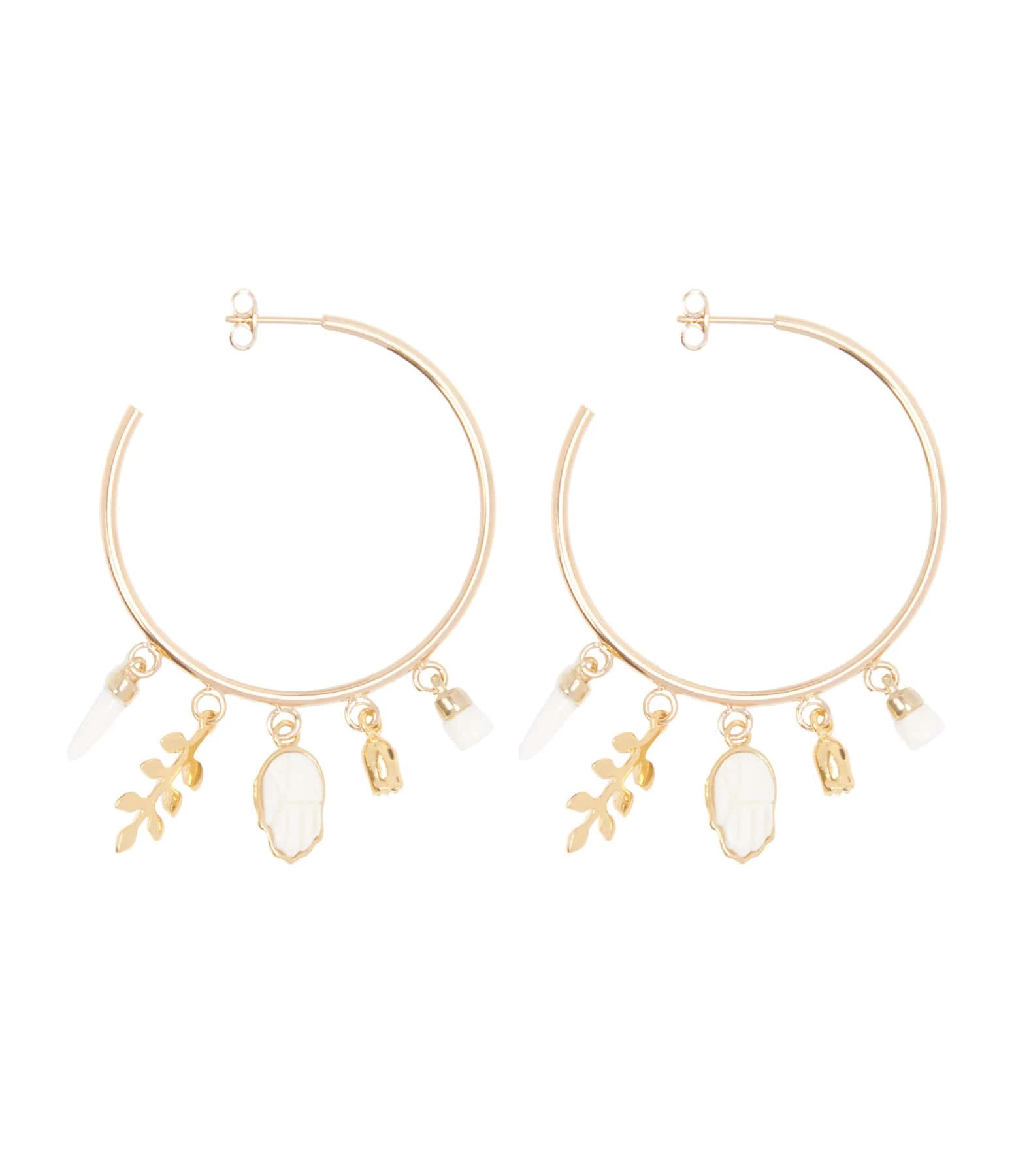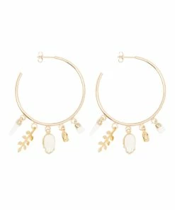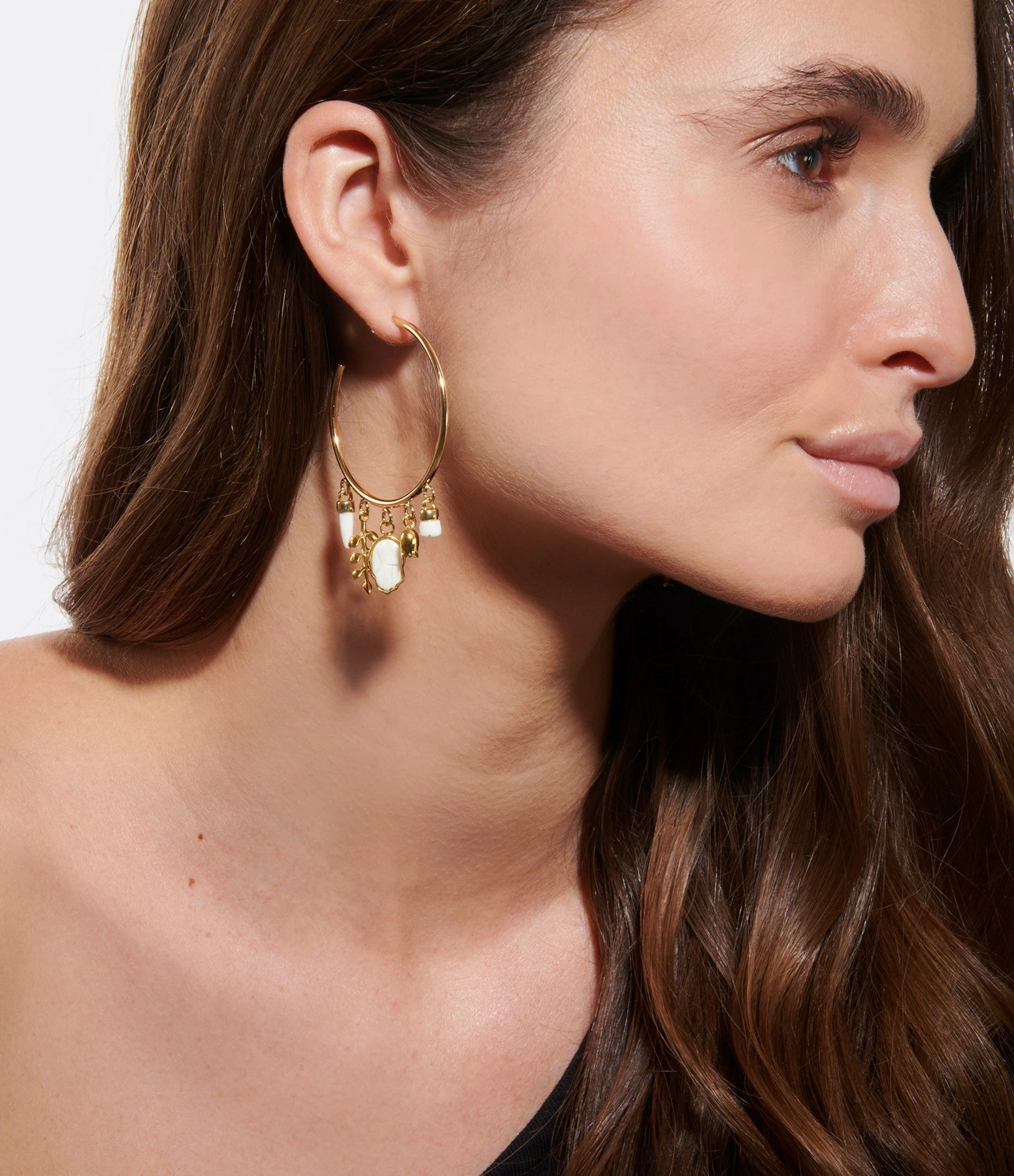 Créoles en laiton agrémentées de pampilles écrus. Fermoir poussette.