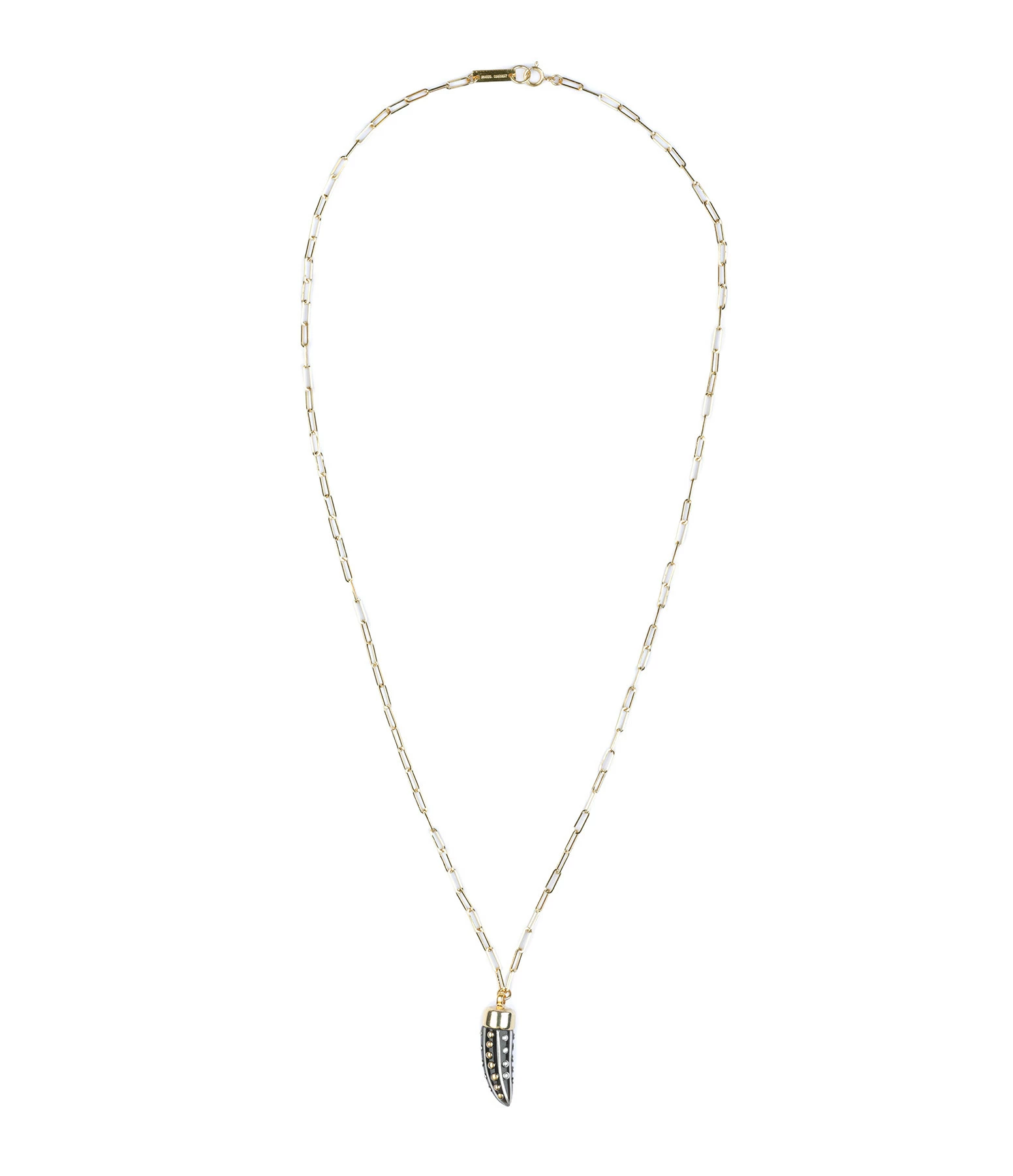 Sautoir sur chaîne en laiton doré avec pendentif corne noire et détails dorés. Fermoir classique à ressort.