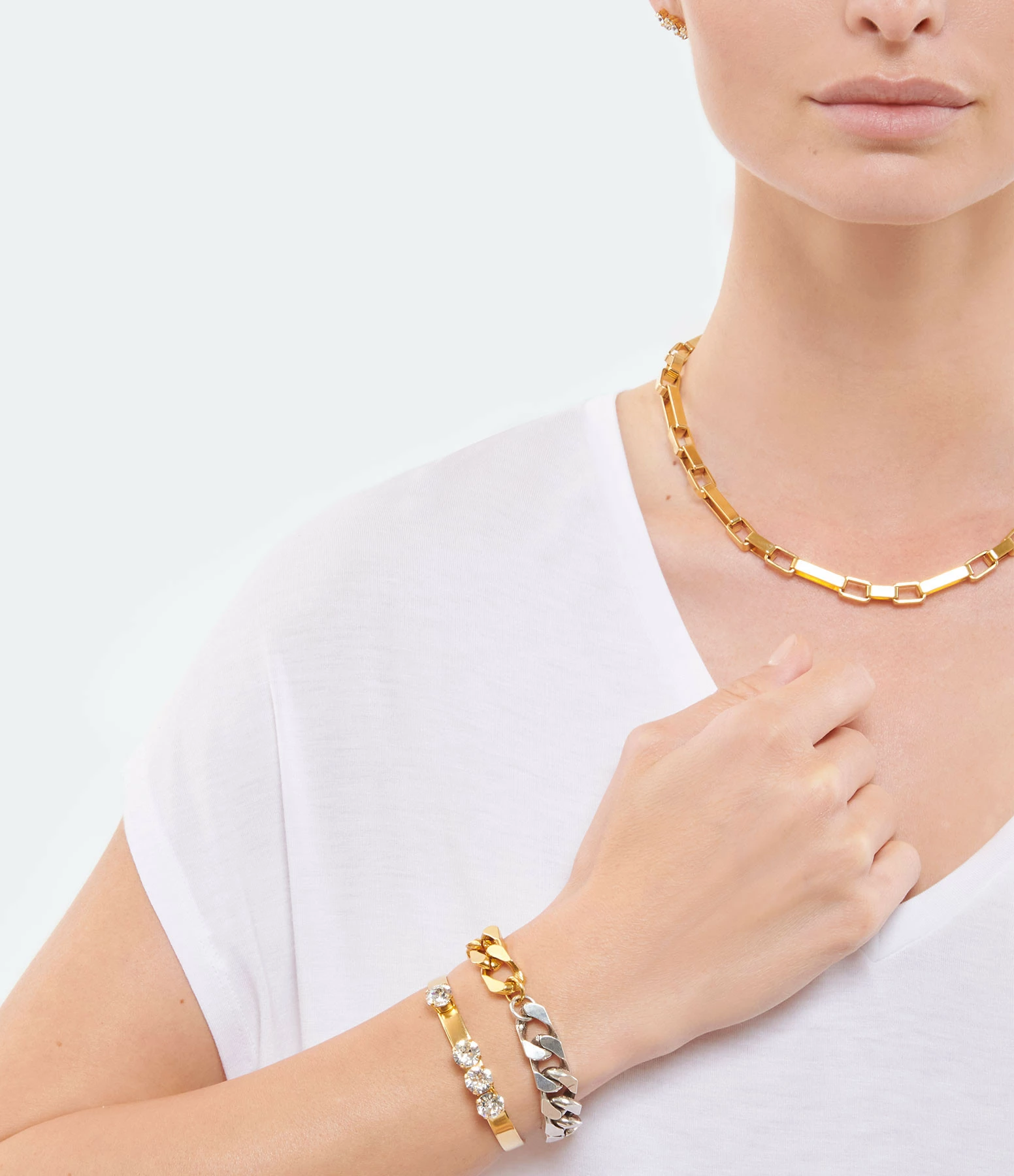 Conseil stylistique : Le bracelet gourmette revisité. Le mélange de l’or et de l’argent, cher à la marque, en fait un basique de style. À porter en accumulation avec d’autres modèles à grosse maille pour un look moderne et assumé.