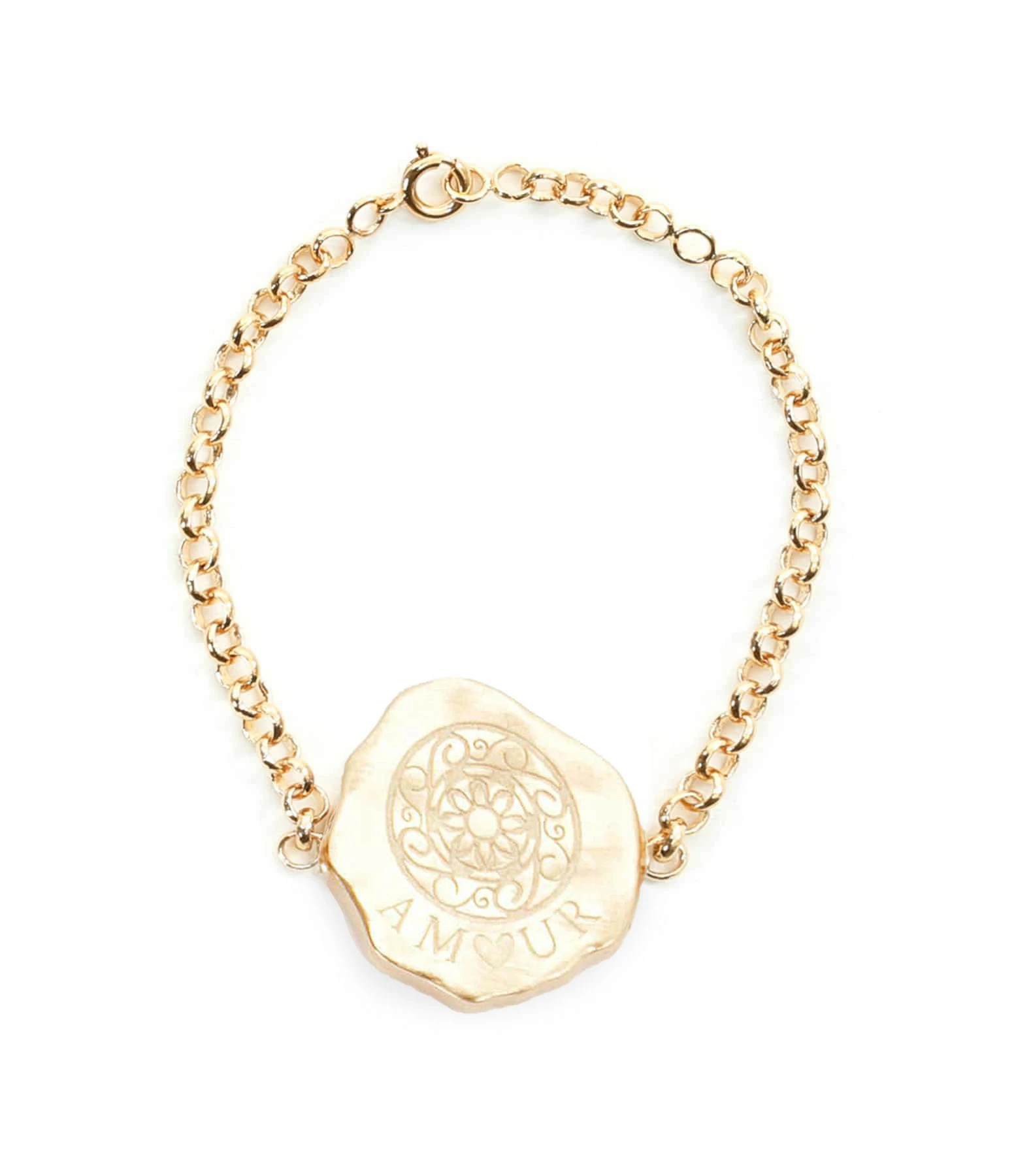 Bracelet sur chaîne agrémenté d’un pendentif sur lequel est gravé “Amour”. Fermoir classique à ressort.