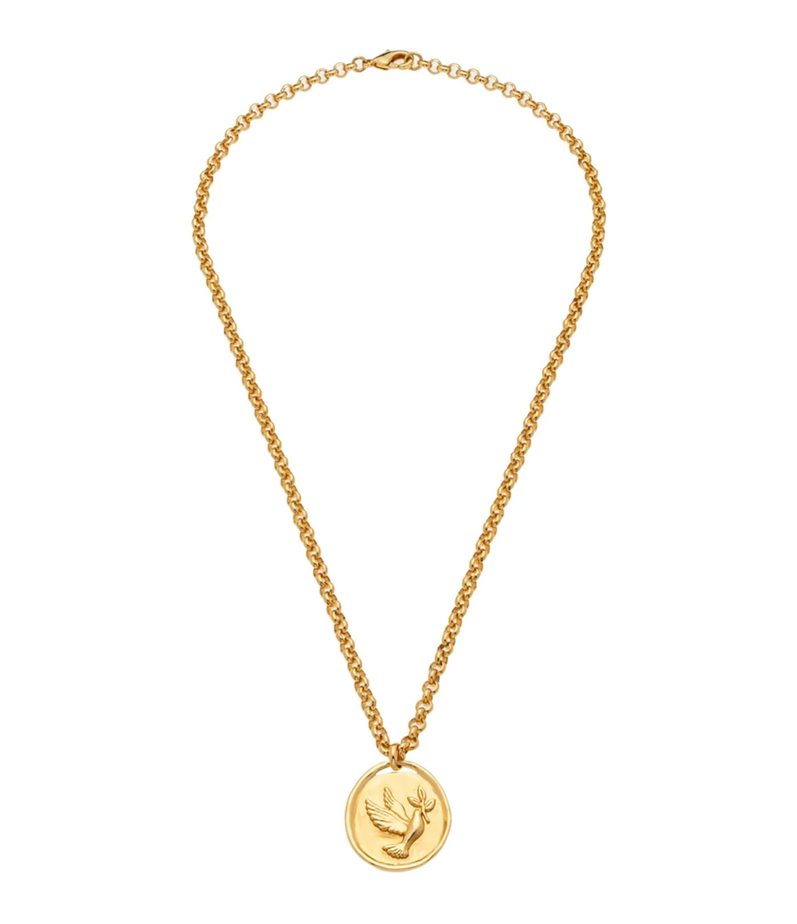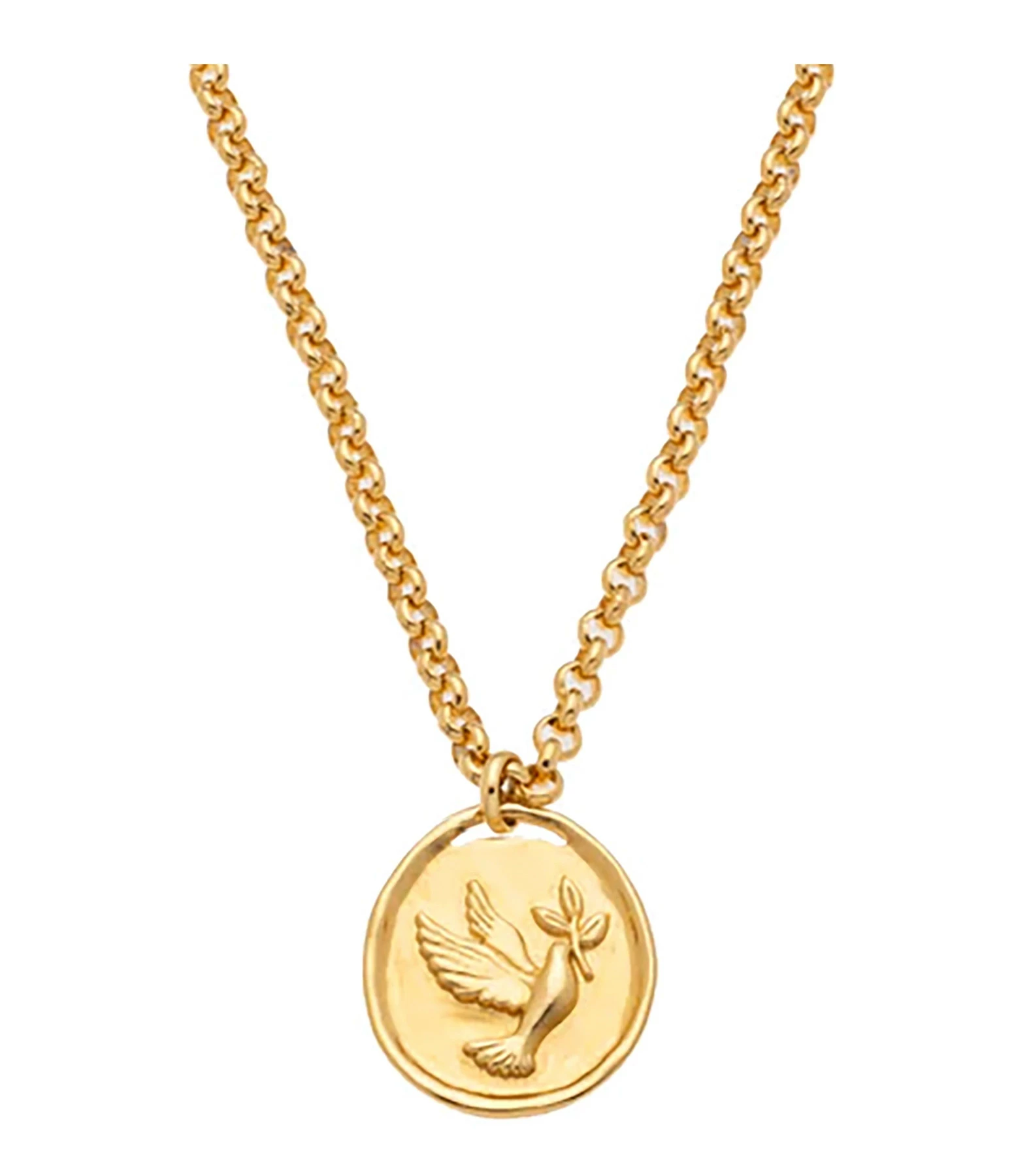 Collier sur chaîne en maille forçat agrémenté d’un pendentif avec gravure en relief colombe. Fermoir classique à ressort.