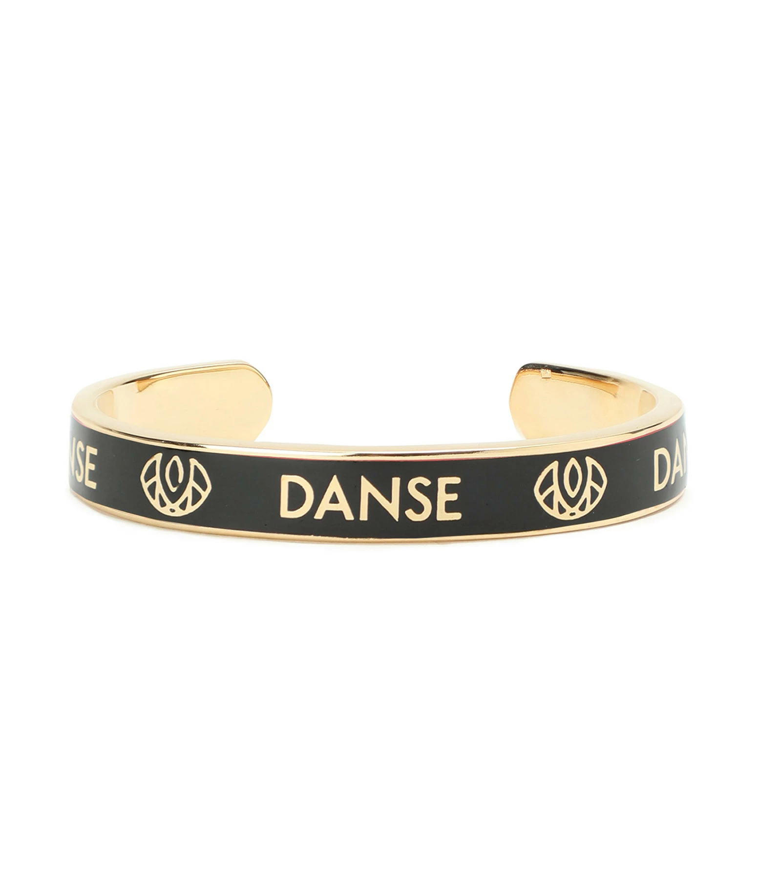 Bracelet jonc en laiton doré et émail noir avec sérigraphie “Danse” et logo de la marque. Jonc rigide, non réglable.