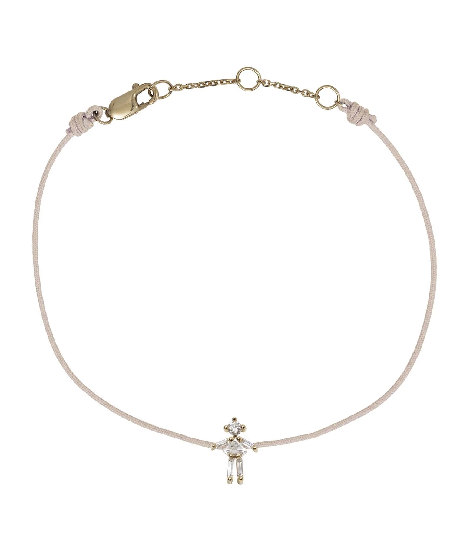 Bracelet sur cordon rose pâle avec pampille petite fille en or rose serti de 6 diamants naturels taillés. Fermoir classique à ressort.