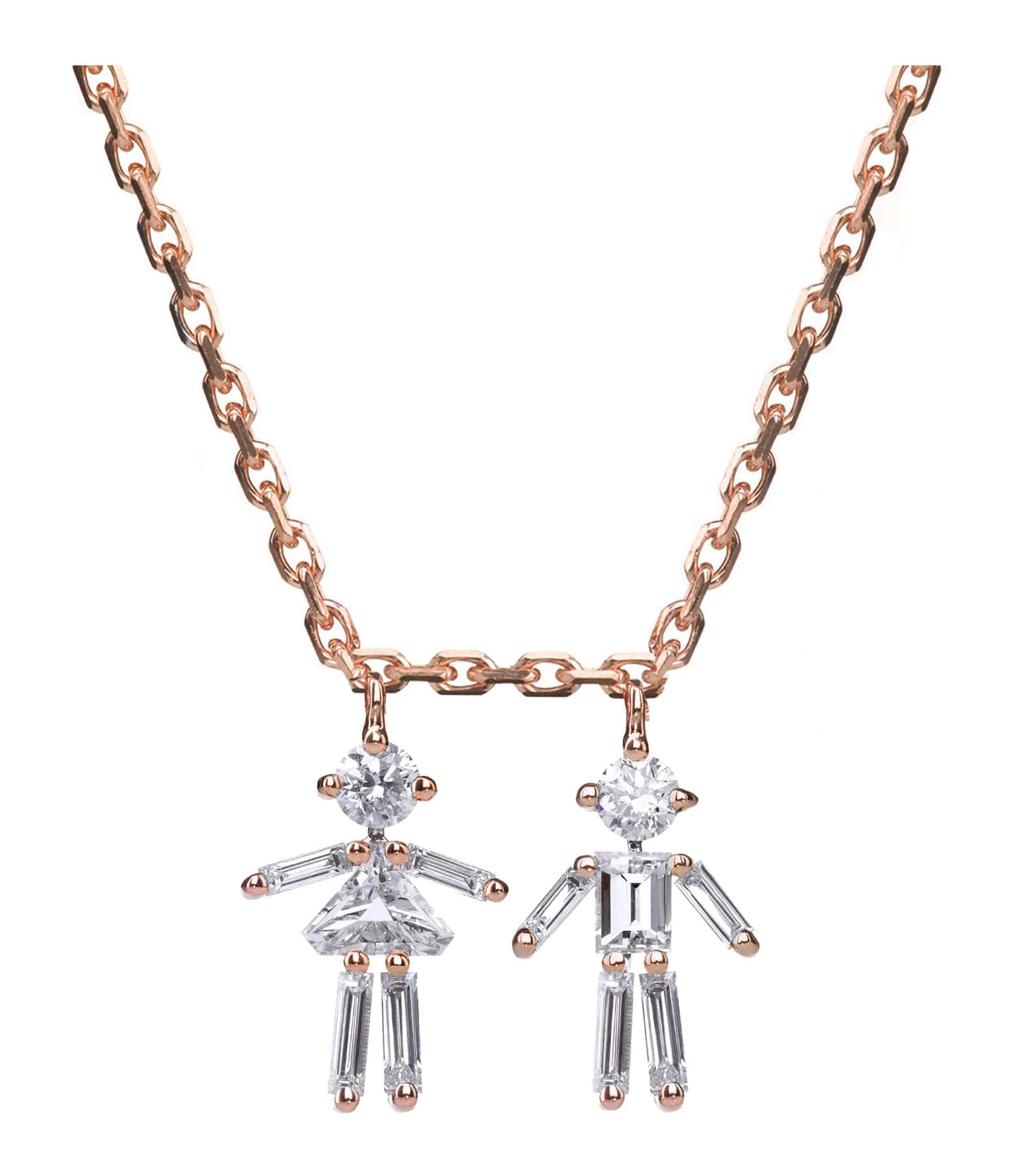 Collier sur chaîne en or rose avec deux petits pendentifs fille et garçon sertis de 6 diamants naturels taillés. Fermoir classique à ressort avec contre-anneau.