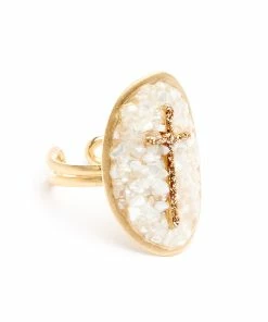 Bague ouverte en argent doré à l’or fin avec gros médaillon en nacre et croix en émail diamanté. Ajustable.