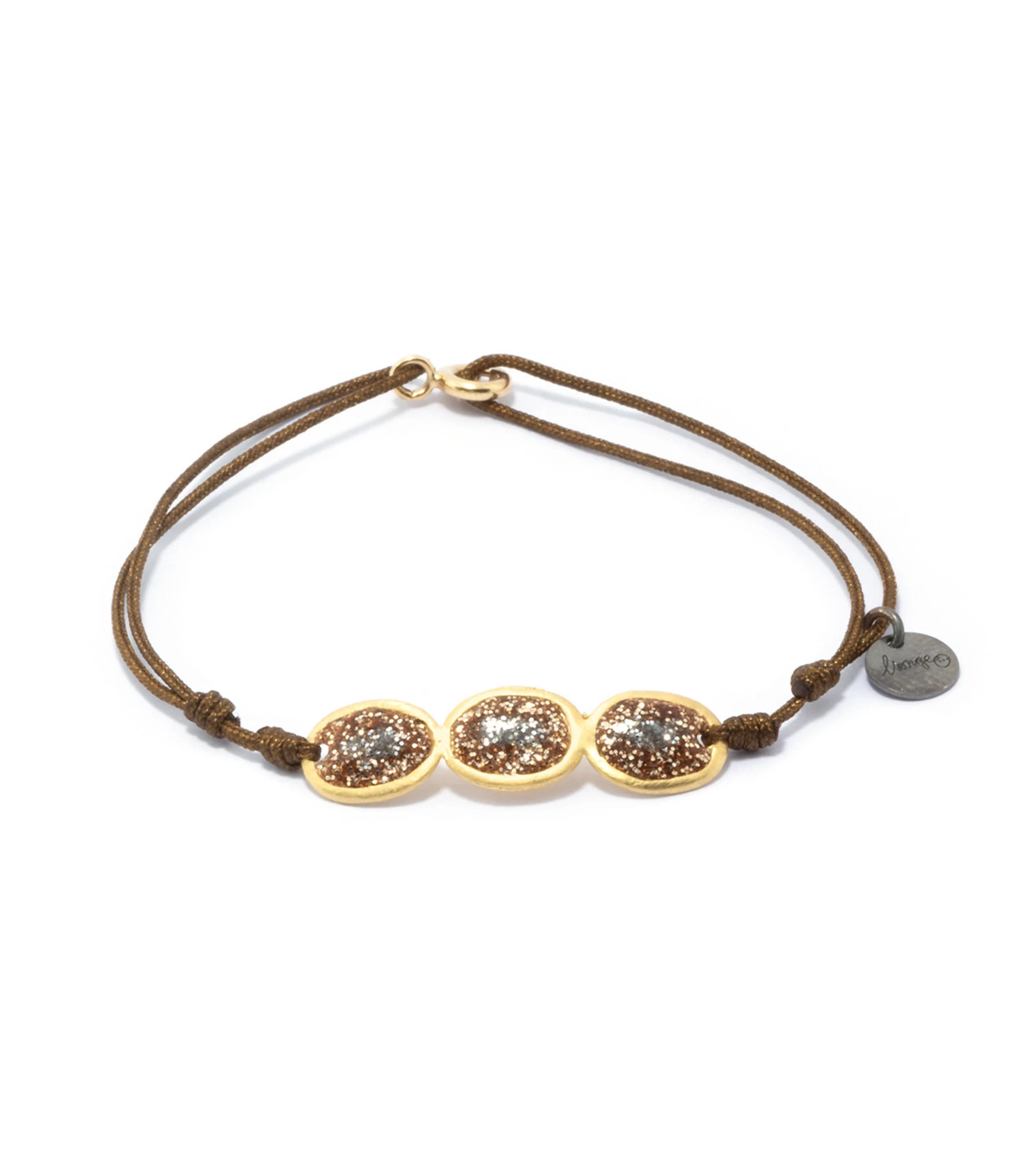 Bracelet sur cordon, avec trois médailles en argent doré à l’or fin et émail pailleté. Fermoir à ressort et nœuds coulissants.