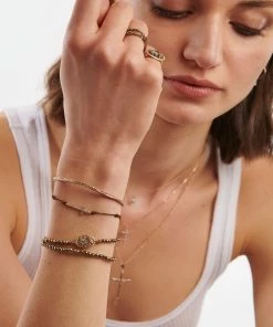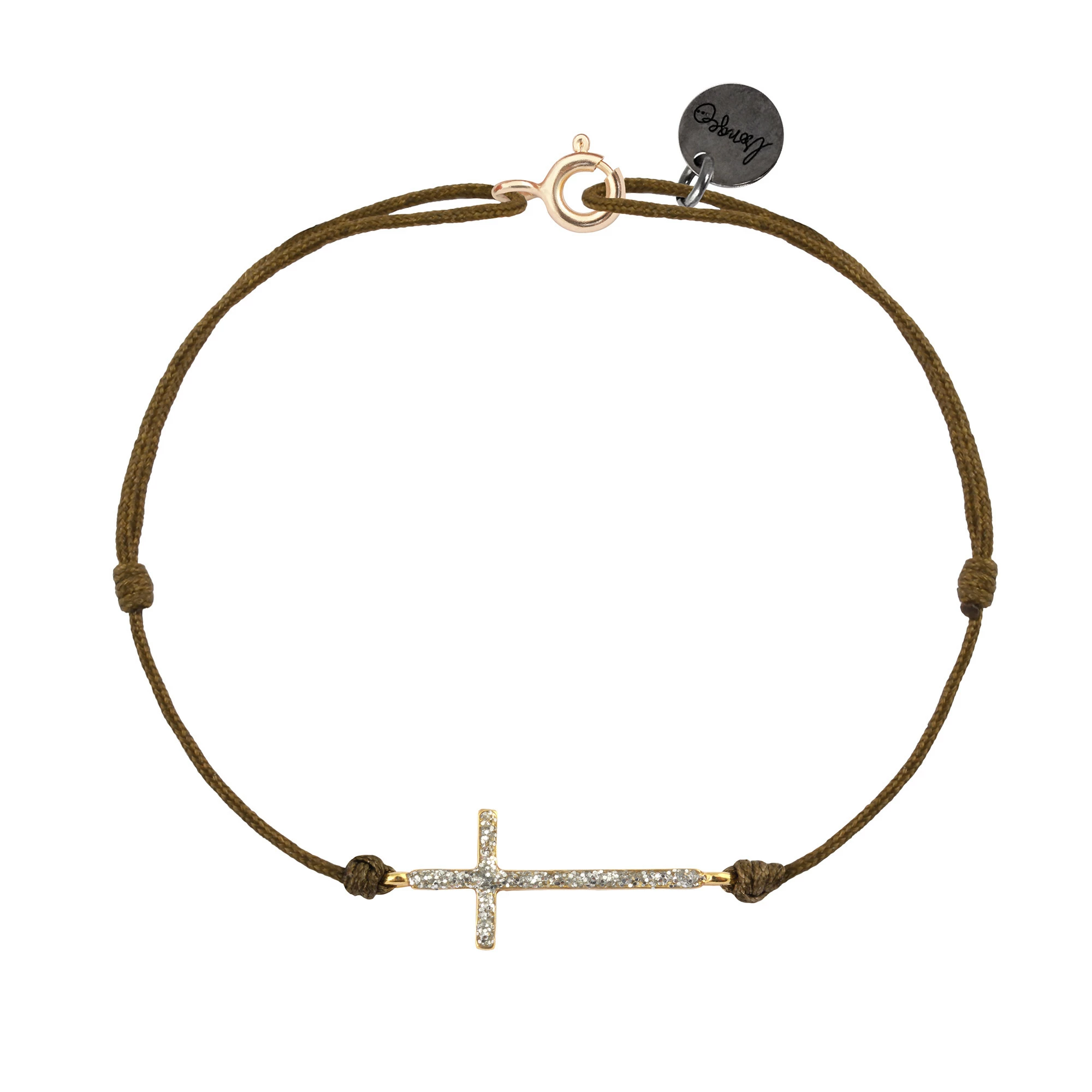 Bracelet sur cordon, avec croix en argent doré à l’or fin et paillettes. Fermoir à ressort et nœuds coulissants.