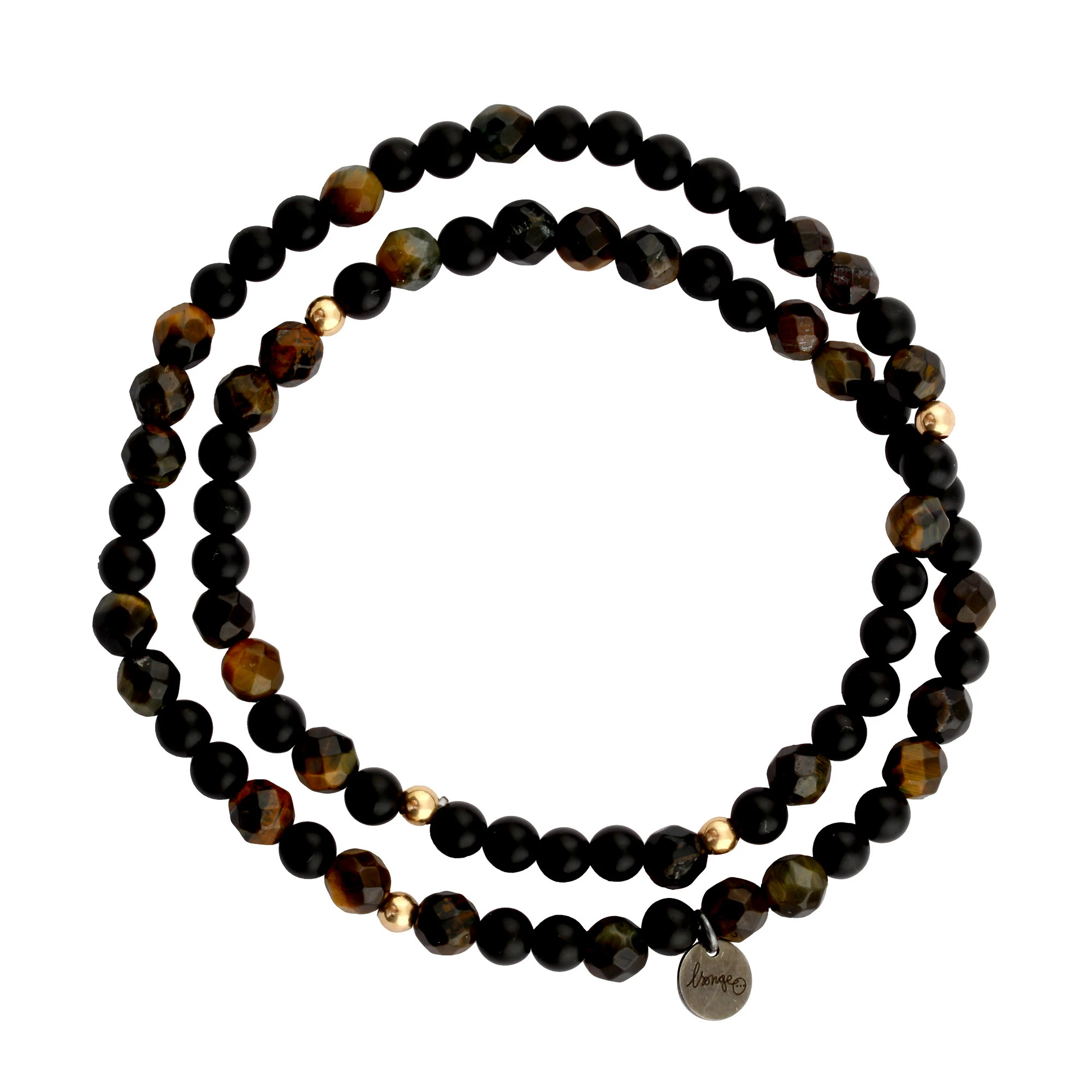 Bracelet double-tour, élastiqué en perles facettées d’Onyx et Œil de Tigre, et perles en plaqué or.