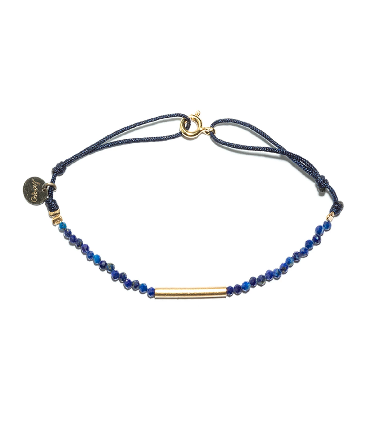 Bracelet sur cordon noir en perles lapis et turquoises. Tube doré. Fermoir à ressort et nœuds coulissants.