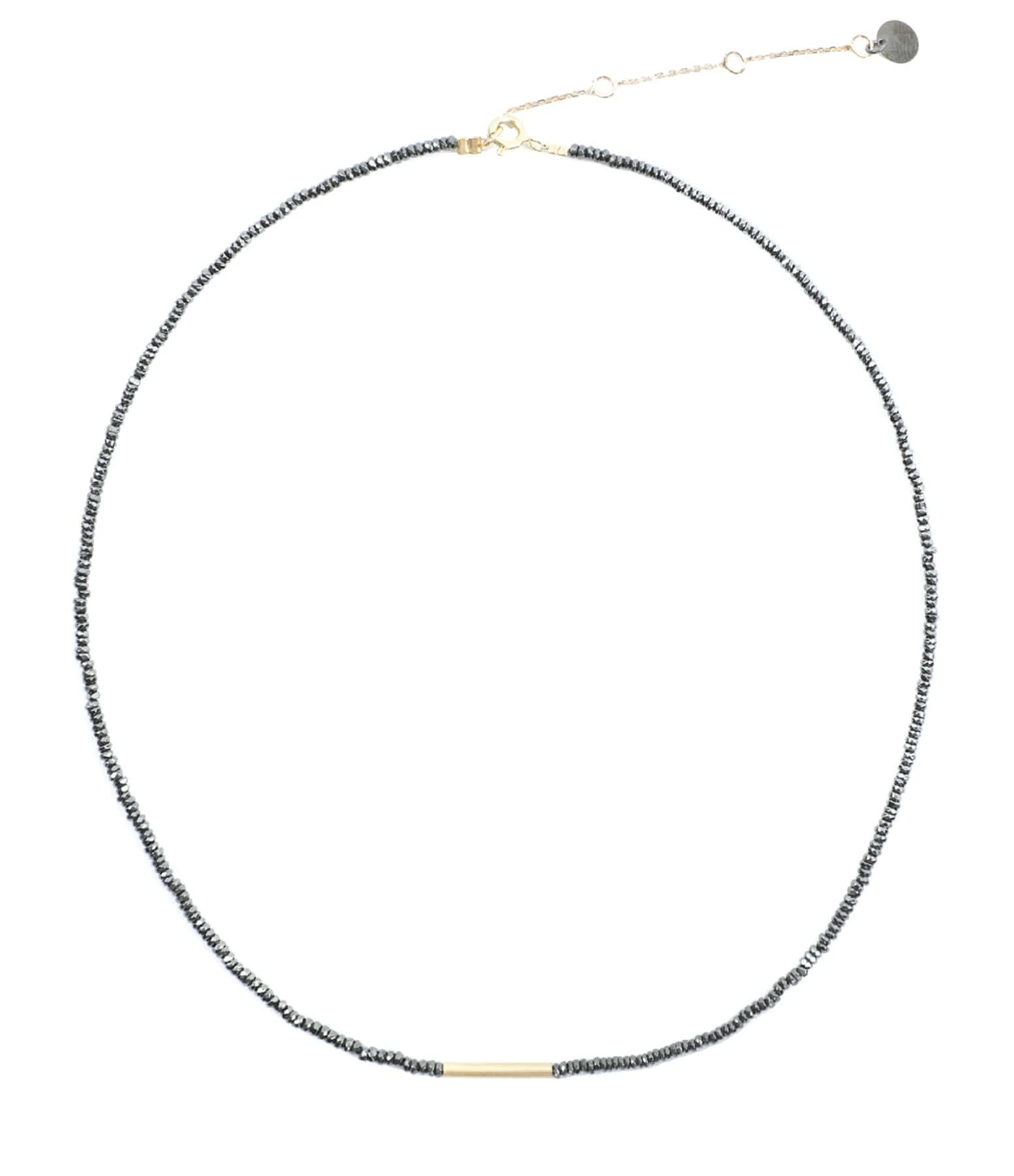 Collier sur perles en hématites, avec tube en argent plaqué or. Fermoir à ressort et chaînette de réglage.