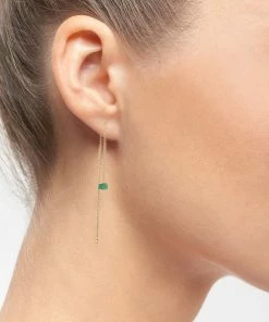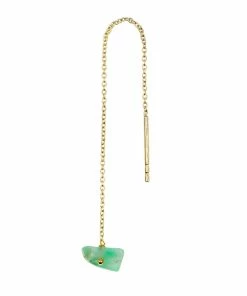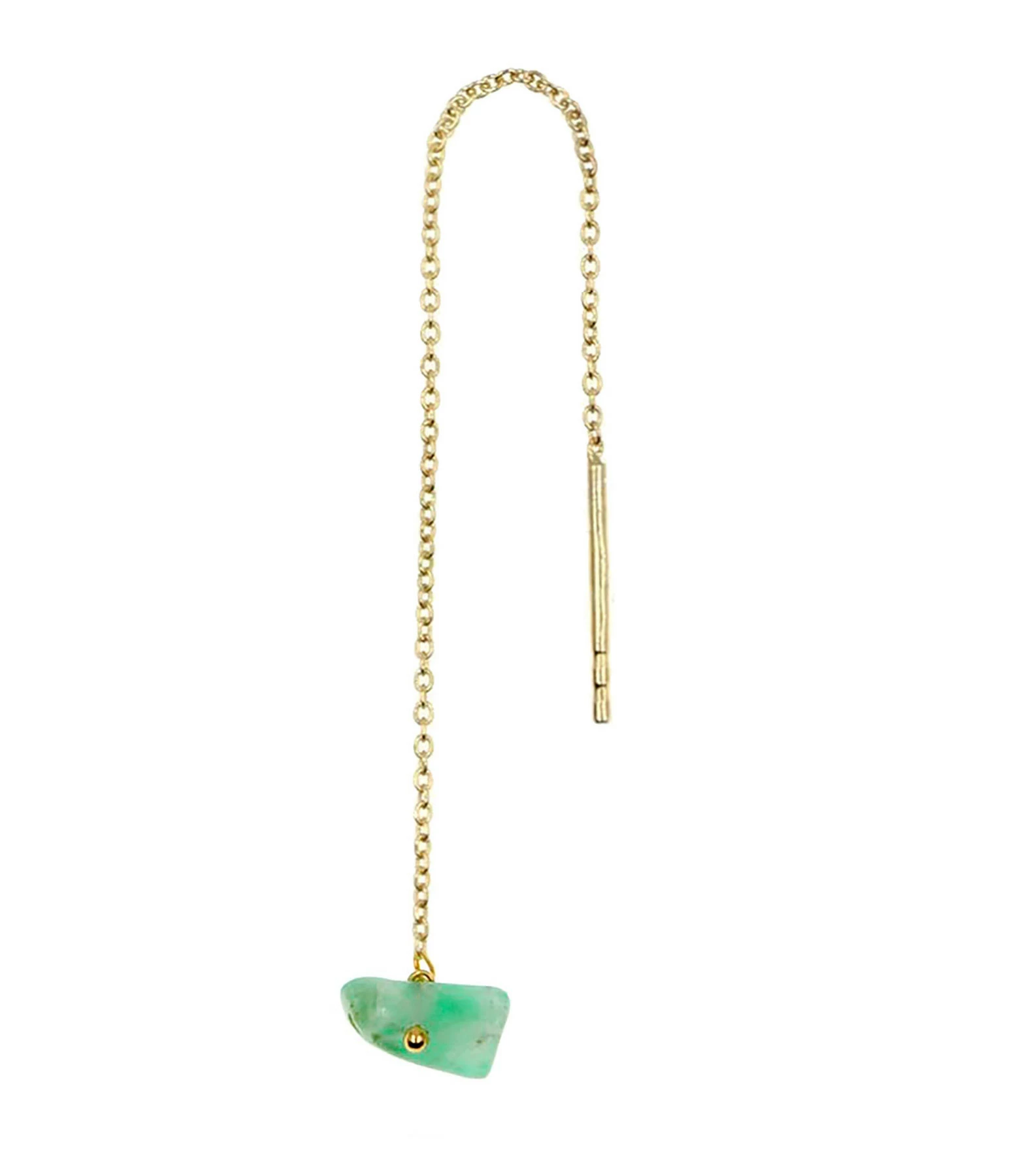 Boucle d’oreilles pendante en or jaune agrémentée d’une pierre de chrysoprase. Système sans fermoir : la tige et la chaînette sont glissées délicatement dans le trou de l’oreille.