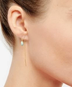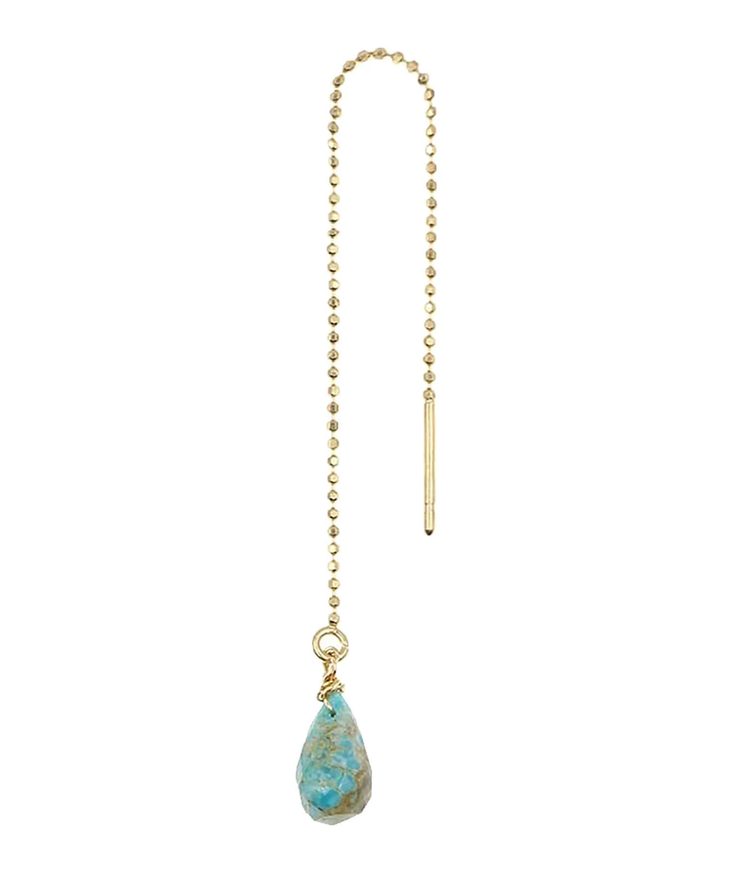 Boucle d’oreilles pendante en or jaune agrémentée d’une pierre de Turquoise. Système sans fermoir : la tige et la chaînette sont glissées délicatement dans le trou de l’oreille.