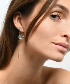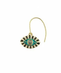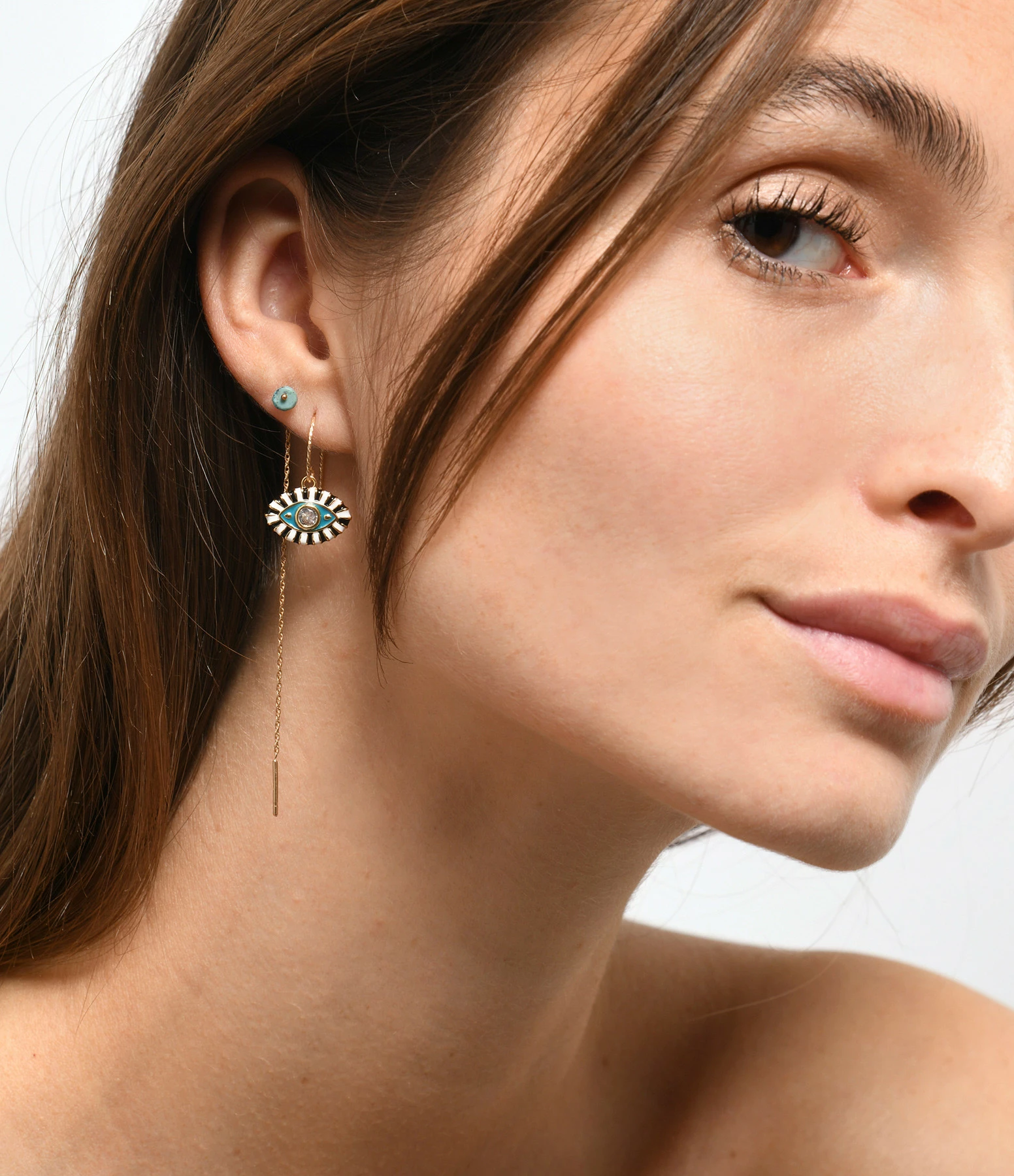 Boucle d’oreille en gold filled avec œil bleu en émail coloré. Attache crochet.