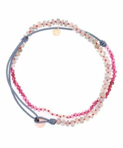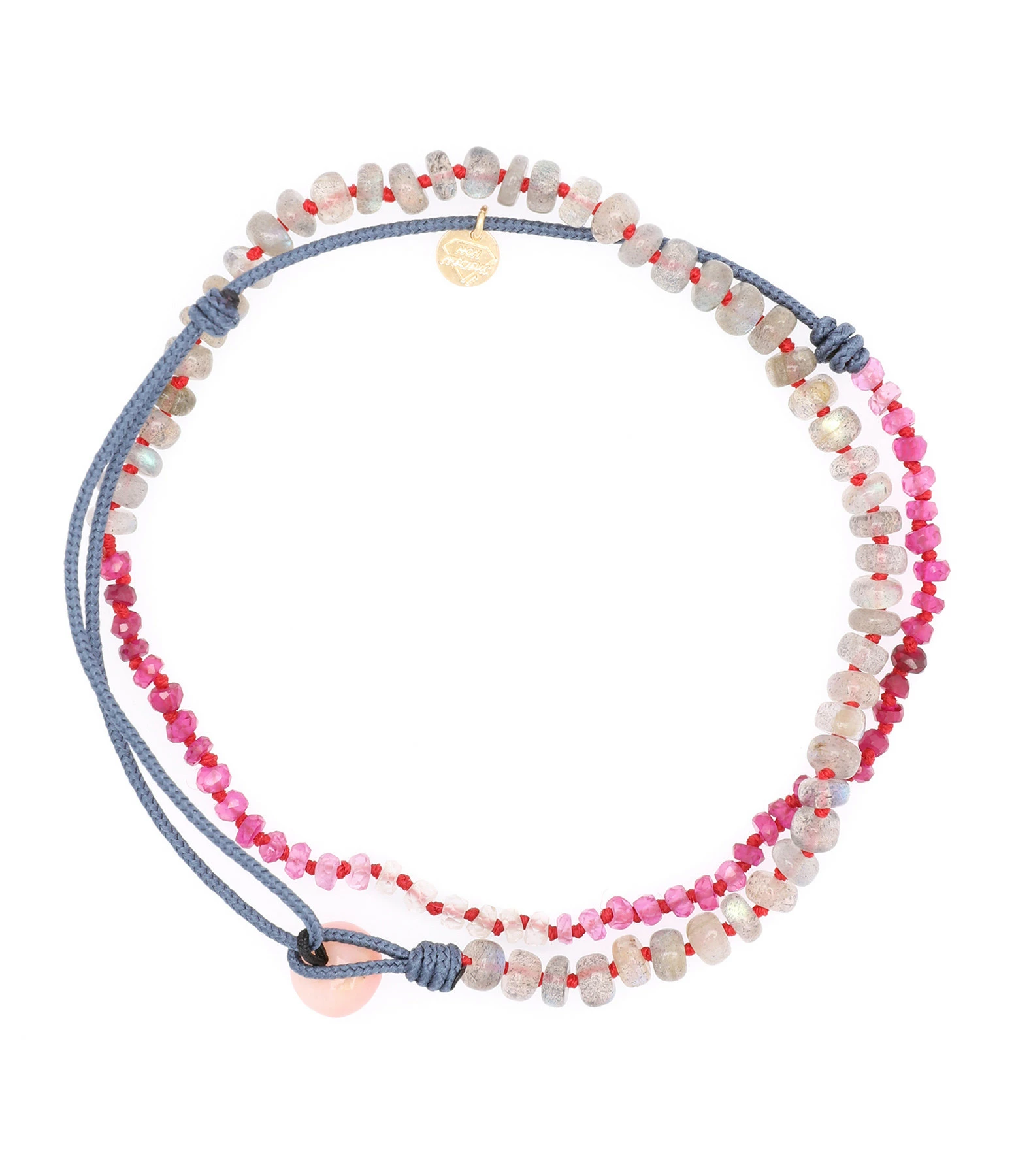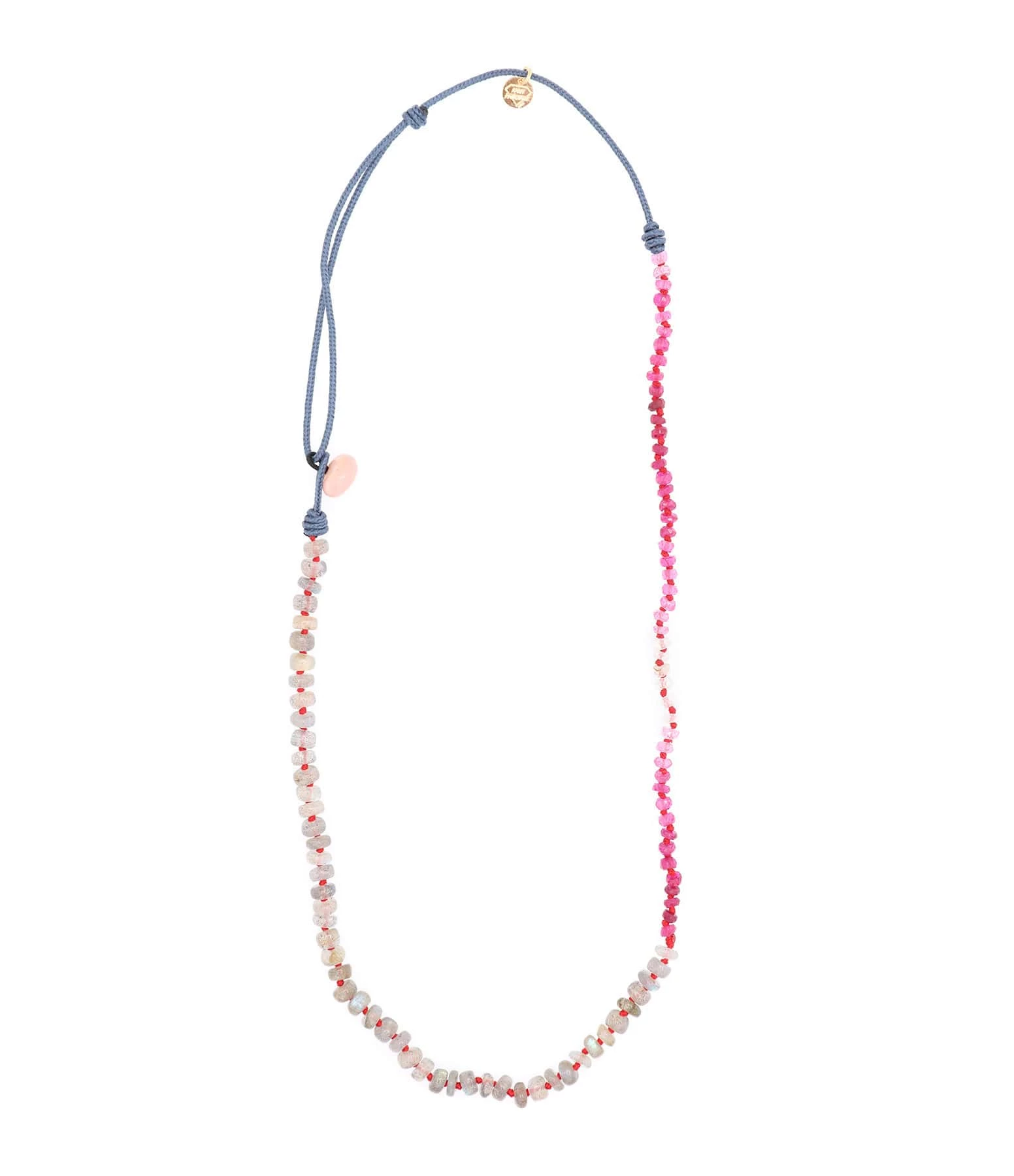 Bijou 1/2/3 sur cordon bleu orné de pierres grises et roses de labradorite et rubis shaded. Grâce à sa boucle de réglage le bracelet 1/2/3 se porte en bracelet, bracelet de cheville et collier.