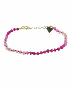 Bracelet en cordon rouge et rubis brut. Fermoir et chaîne de réglage en argent plaqué or.
