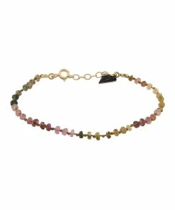 Bracelet en cordon moutarde et pierres de tourmaline. Fermoir et chaîne de réglage en argent plaqué or.