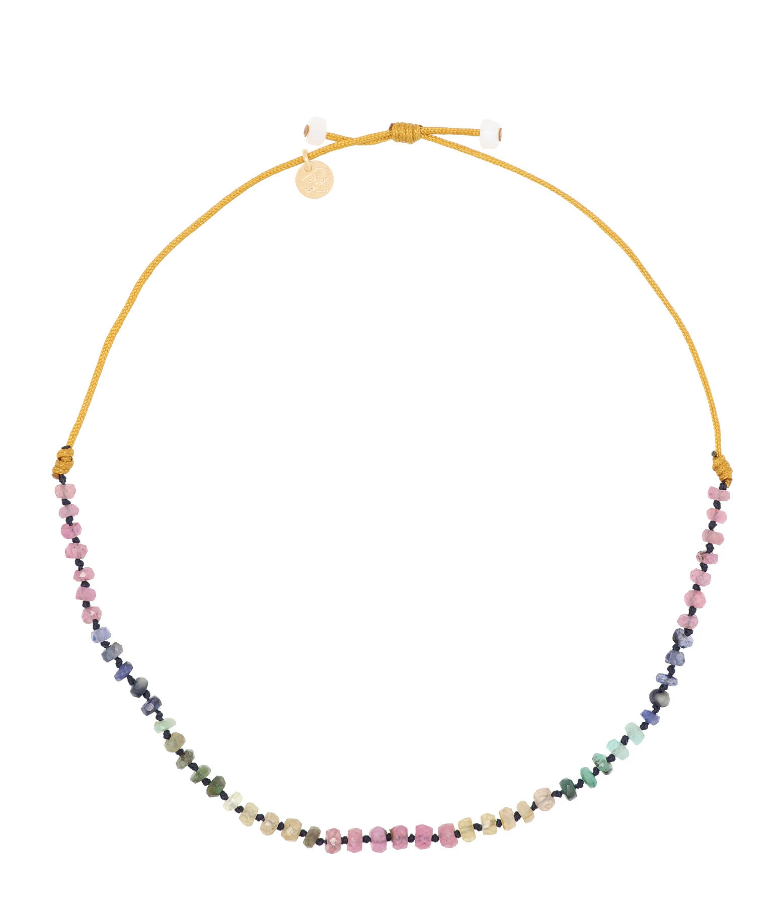 Bracelet de cheville sur cordon doré orné de saphir multicolore. Fermeture par nœud.