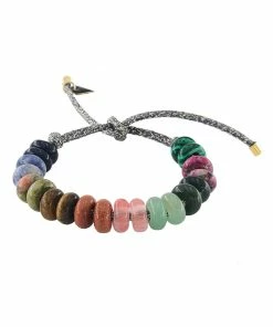 Bracelet en perles multicolores sur cordon gris pailleté coulissant.
