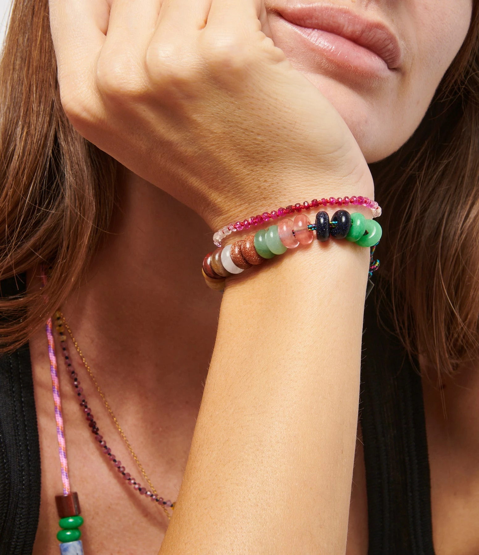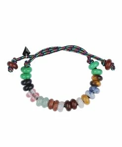 Bracelet en perles multicolores sur cordon noir coulissant.